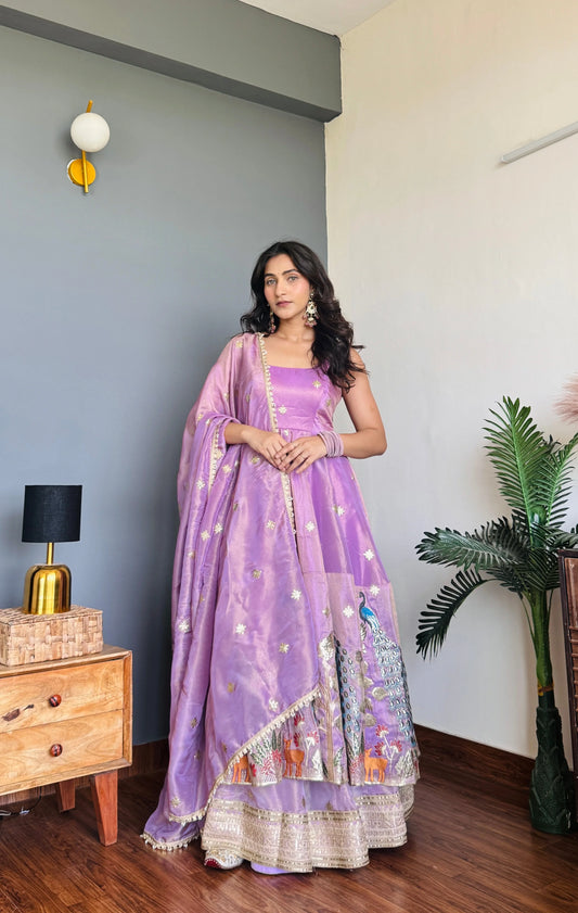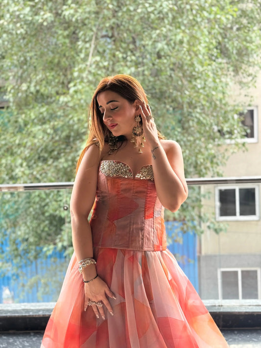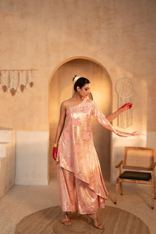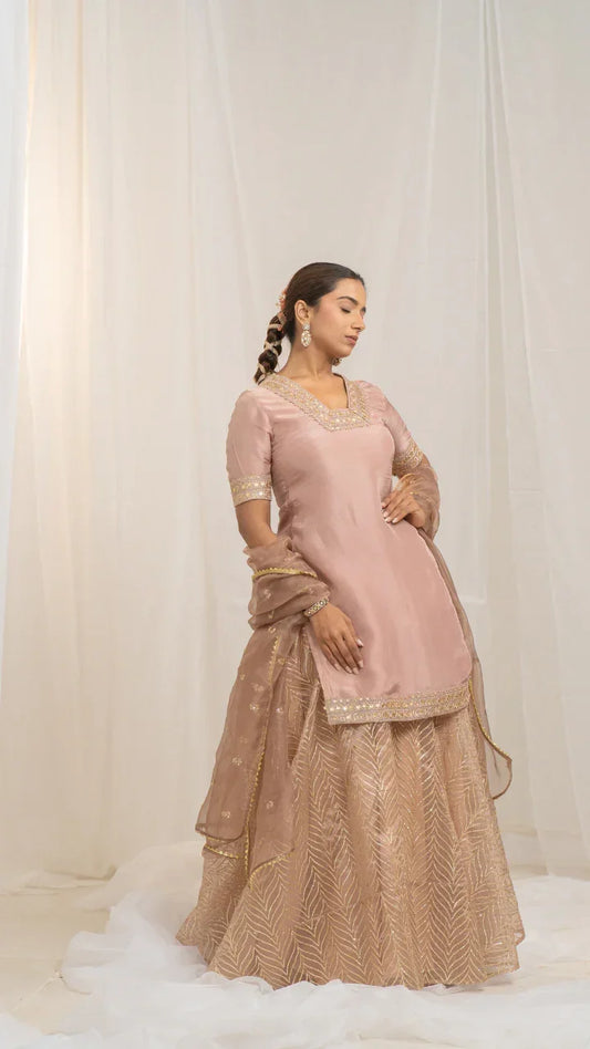 Kaleji Rose Gold Silk Kurta Set with Organza Lehenga and Dupatta
