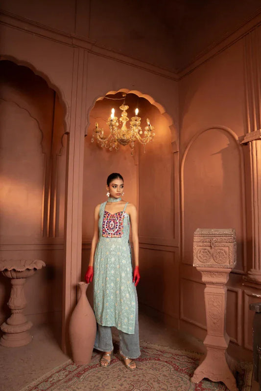 Shaded Hara Hara Kurta Set with Silk Pants and Organza Embroidery