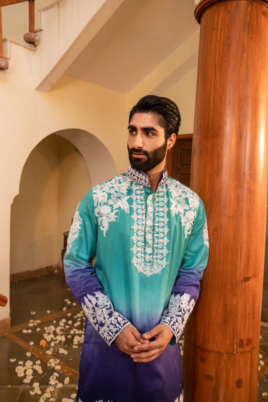 Striking Electric Blue Shaded White Embroidery Kurta