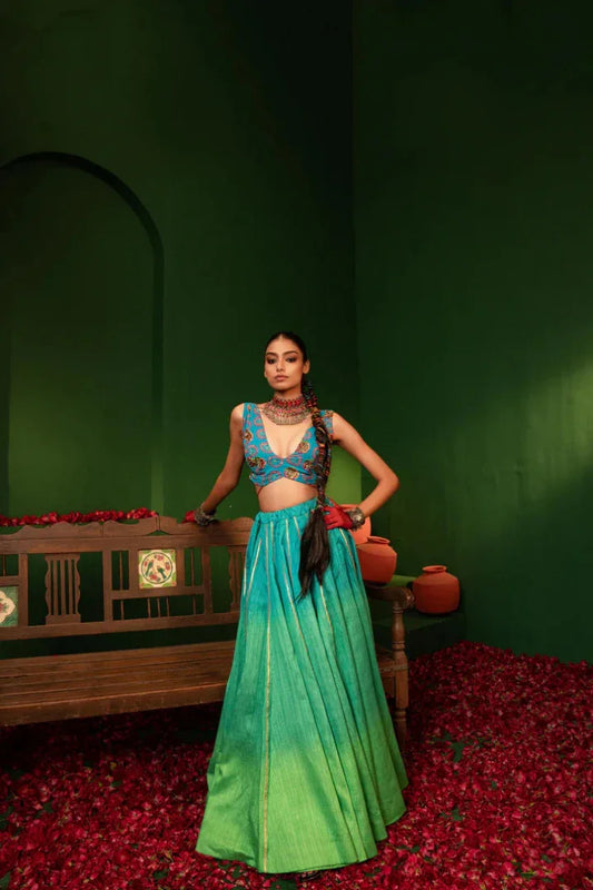 Devi Azure Silk Lehenga in Raw Silk & Crepe