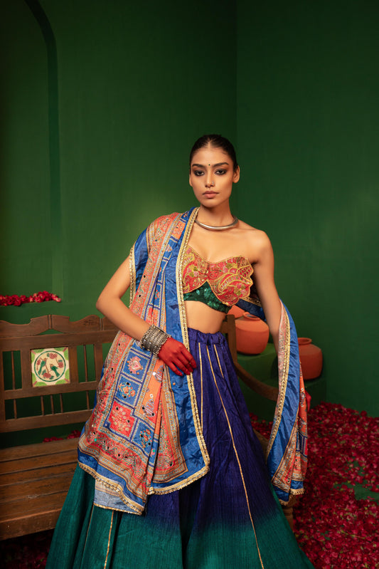 Designer Silk Lehenga Set: Shaded Elegance, Ikat Blouse, Vibrant Dupatta