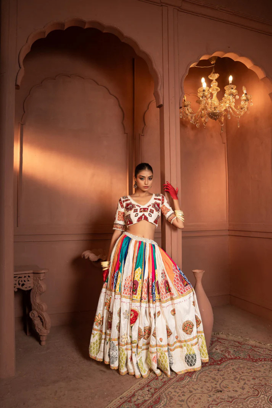 Devi White Emerald Allover Patch Work Silk Lehenga