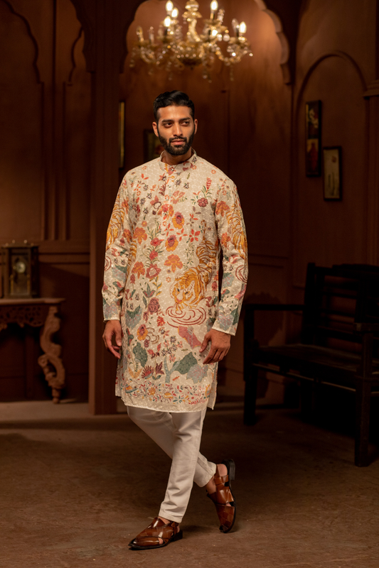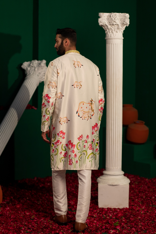 Elegant Lotus and Cattle Motif Printed Embroidered Kurta for Men