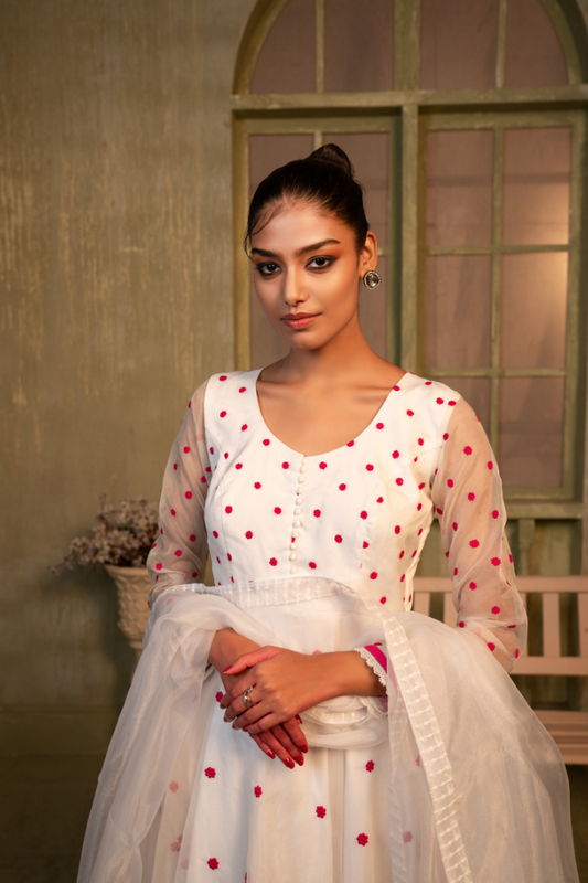 Ethereal Kesari Organza Anarkali with Safed Embroidery, Pants, and Dupatta