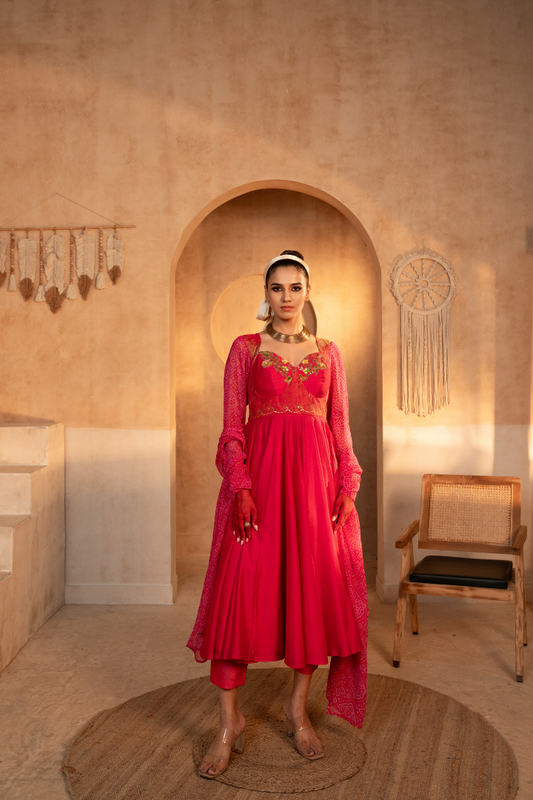 Kesar-Pista Orange Raw Silk Anarkali with White Embroidery and Organza Dupatta