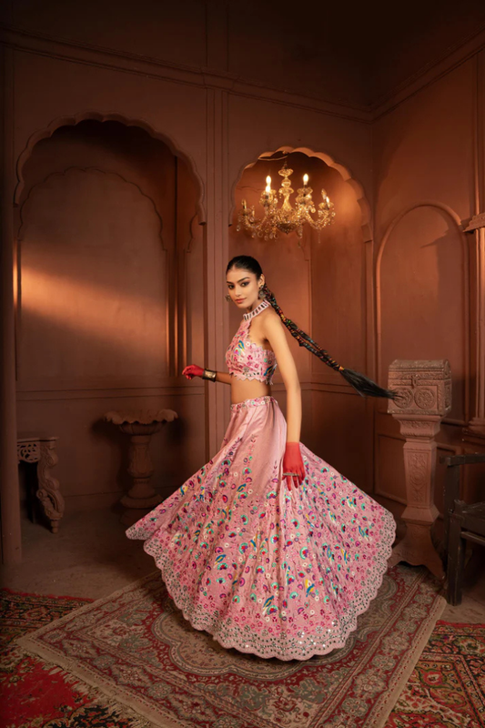 Devi Leela Colour Lehenga with Mirror Work Blouse in Chanderi Silk