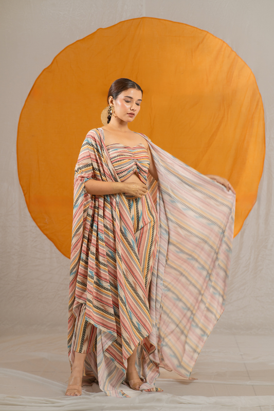 Printed Veil Indowestern Ensemble with Silk Pant, Crop Top, and Shrug