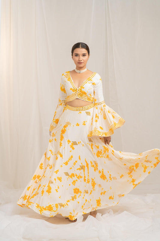 Splashy Draped Skirt with Crop Top and Net Shrug Dupatta