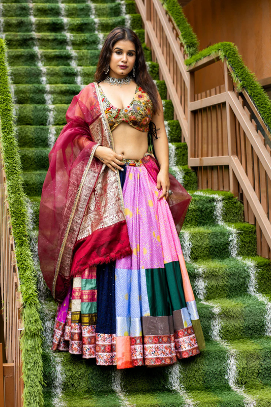 Handcrafted Multicolored Lehenga with Ikat Blouse & Bandhani Dupatta