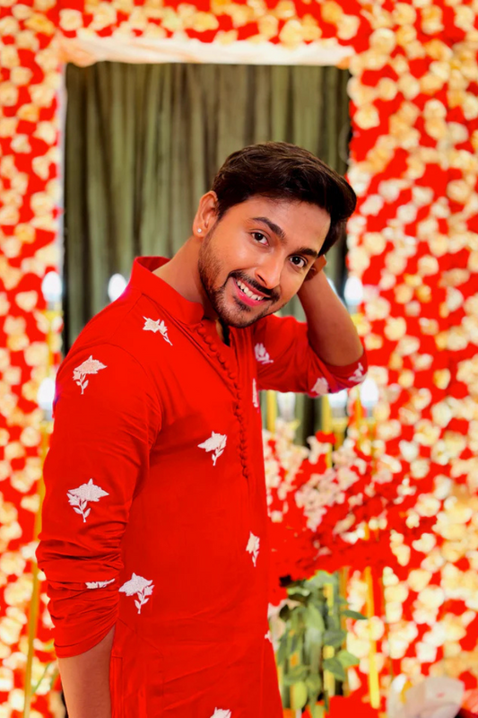 Red Cotton Satin Kurta with Delicate White Embroidery