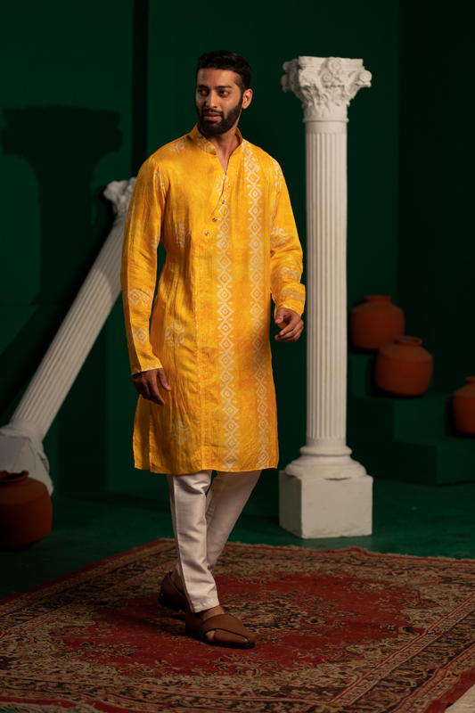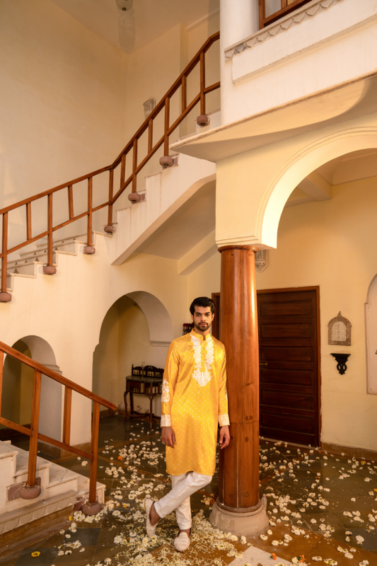 Radiant Jasmine Yellow Bandhani White Embroidery Kurta