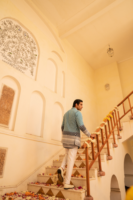 Elegant Tiffany Green Bandhani White Embroidery Kurta