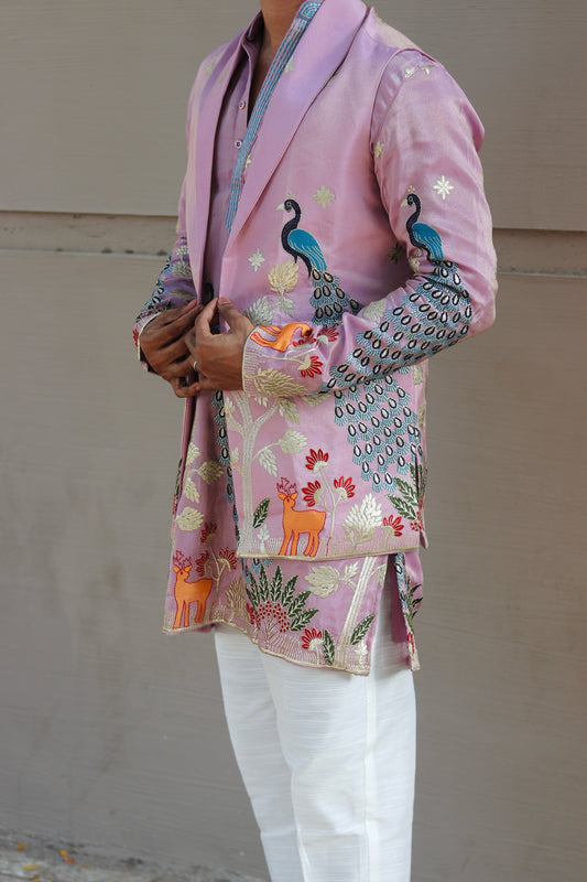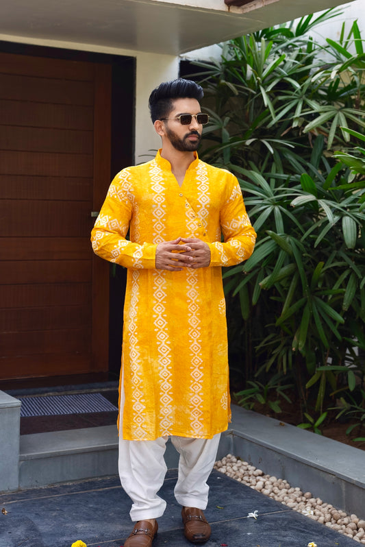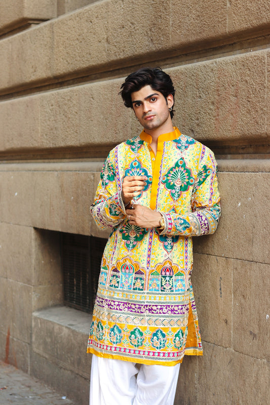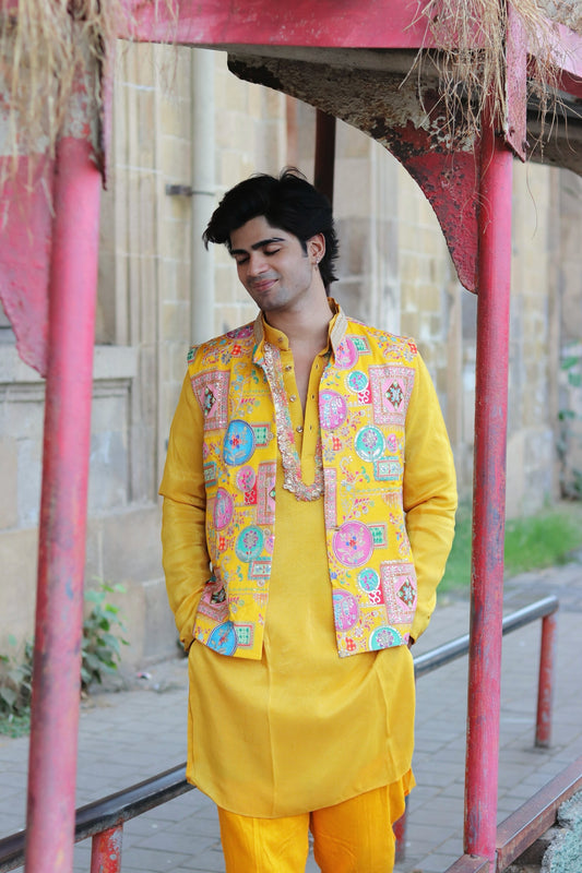 Multi Coloured Embroidery Work On Yellow Koti , Kurta And Pant