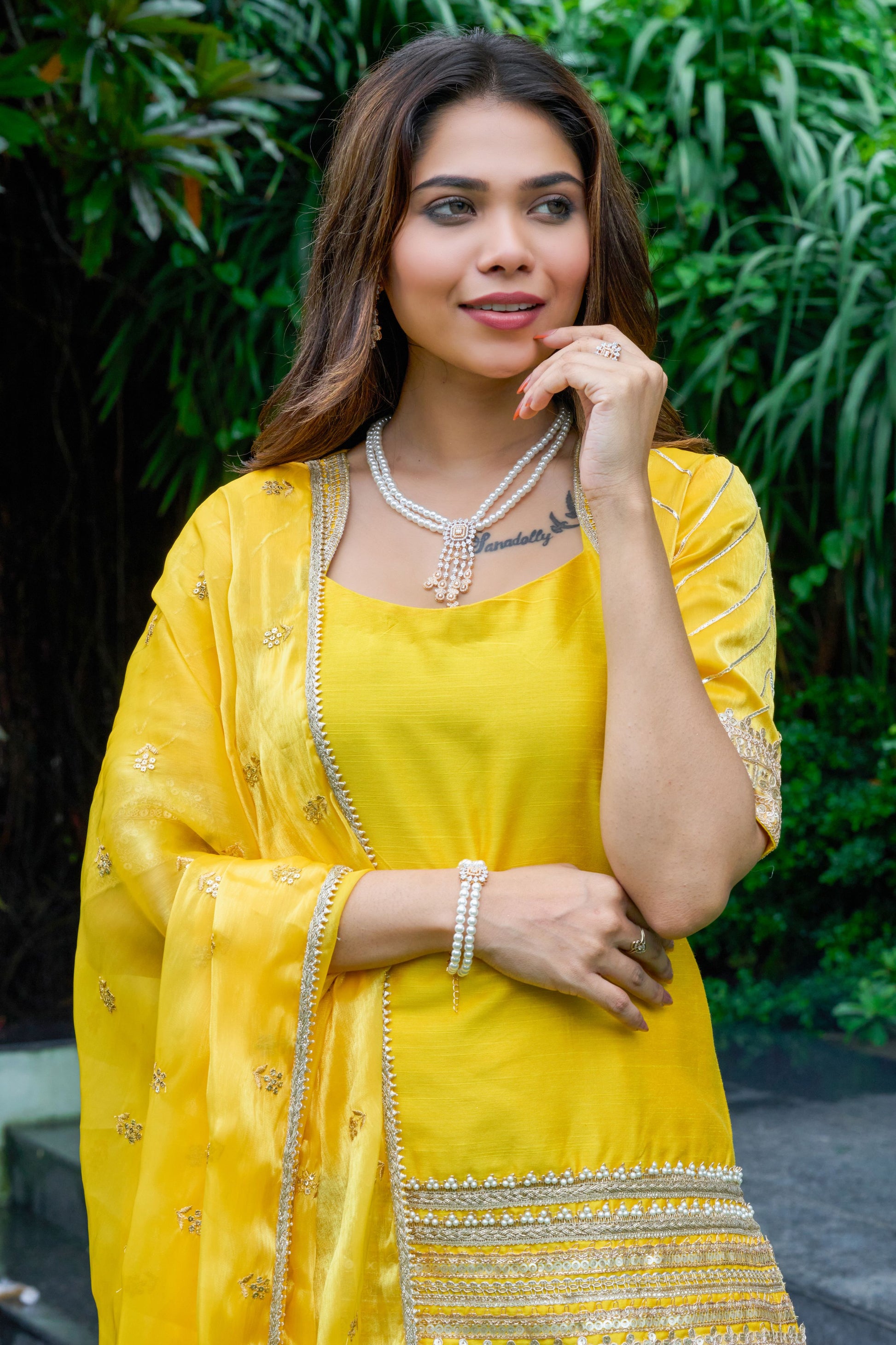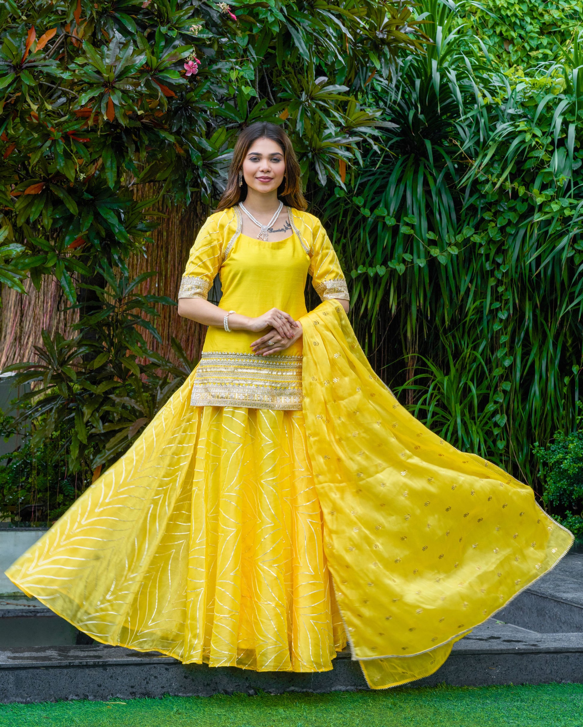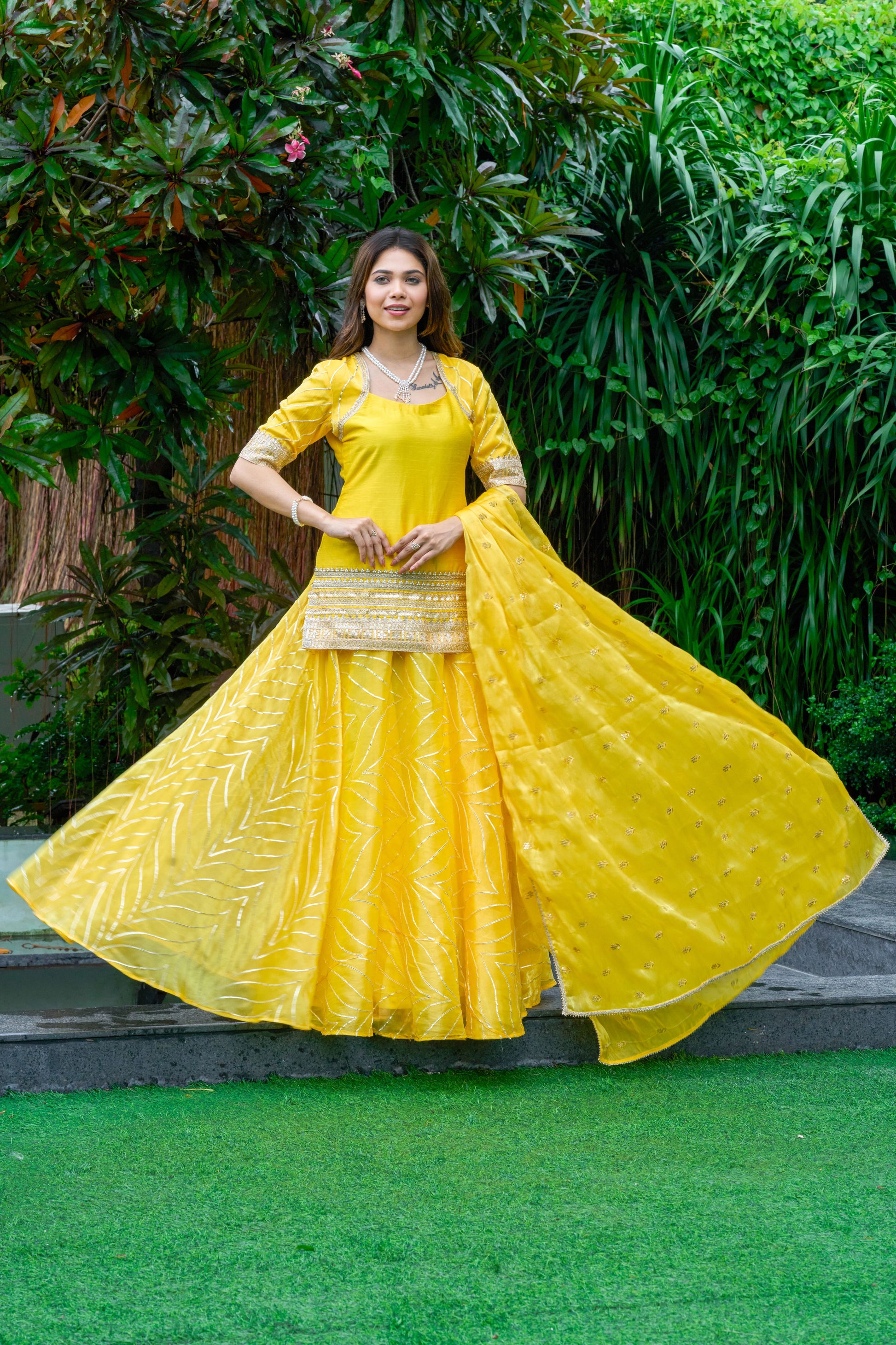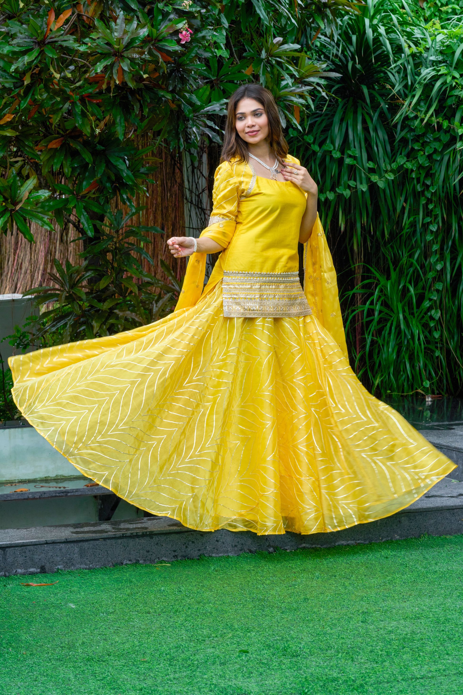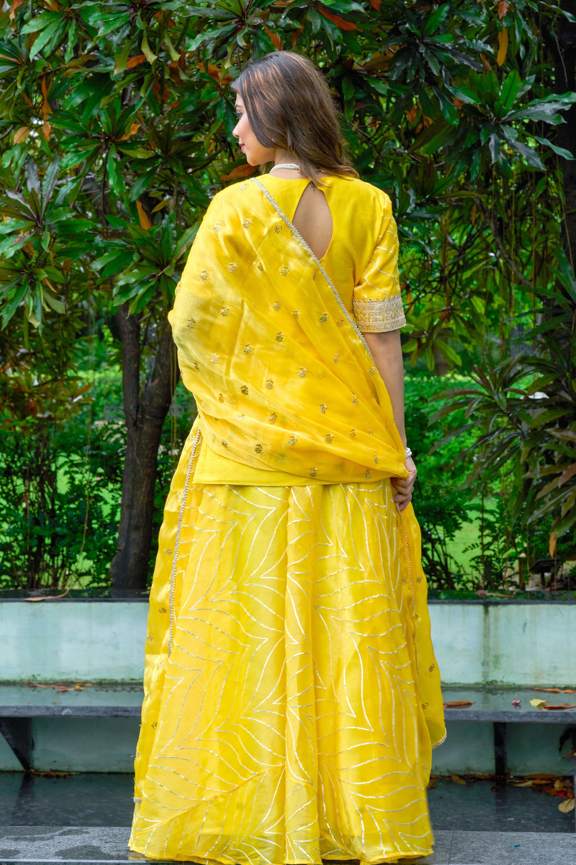 Amber Yellow Gota Lehenga has gota work embroidery on a bright amber yellow fabric. The skirt has a flare that flows when you walk. The top fits well without being tight. The fabric feels light, so you can wear it for hours. Good for weddings, festivities, or family occasions.