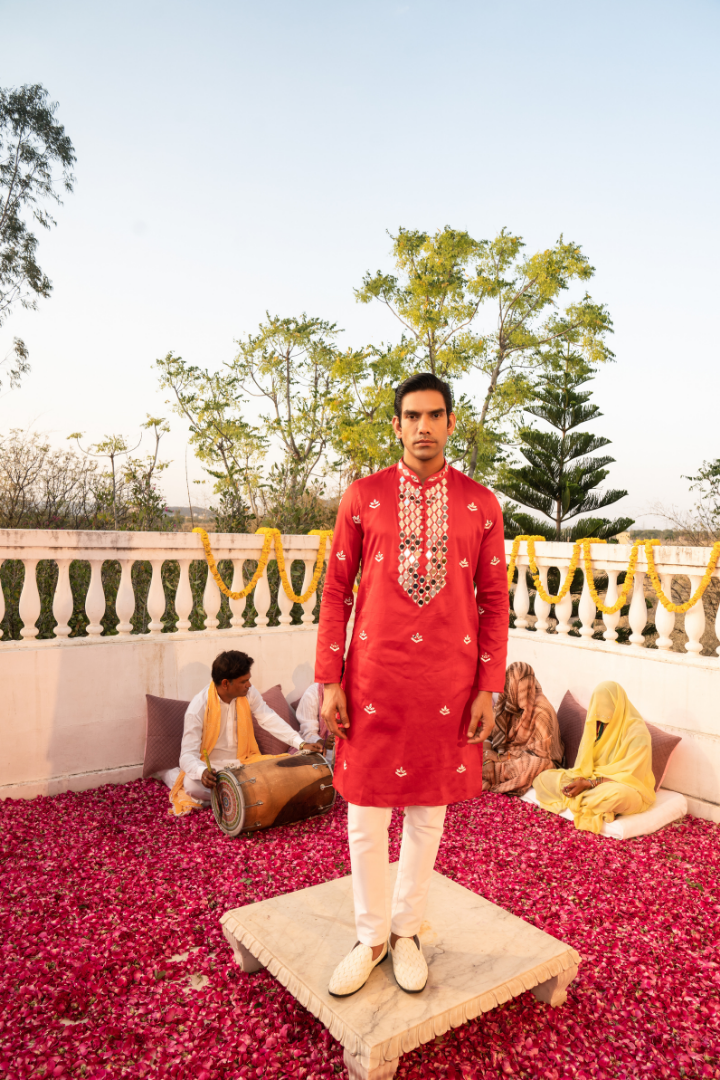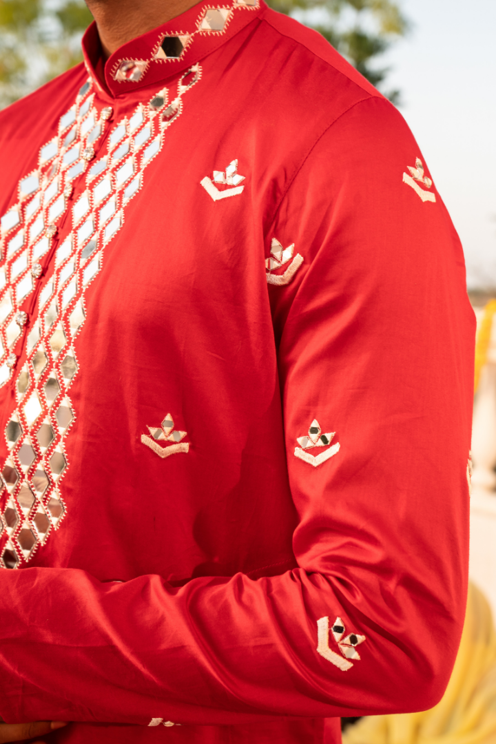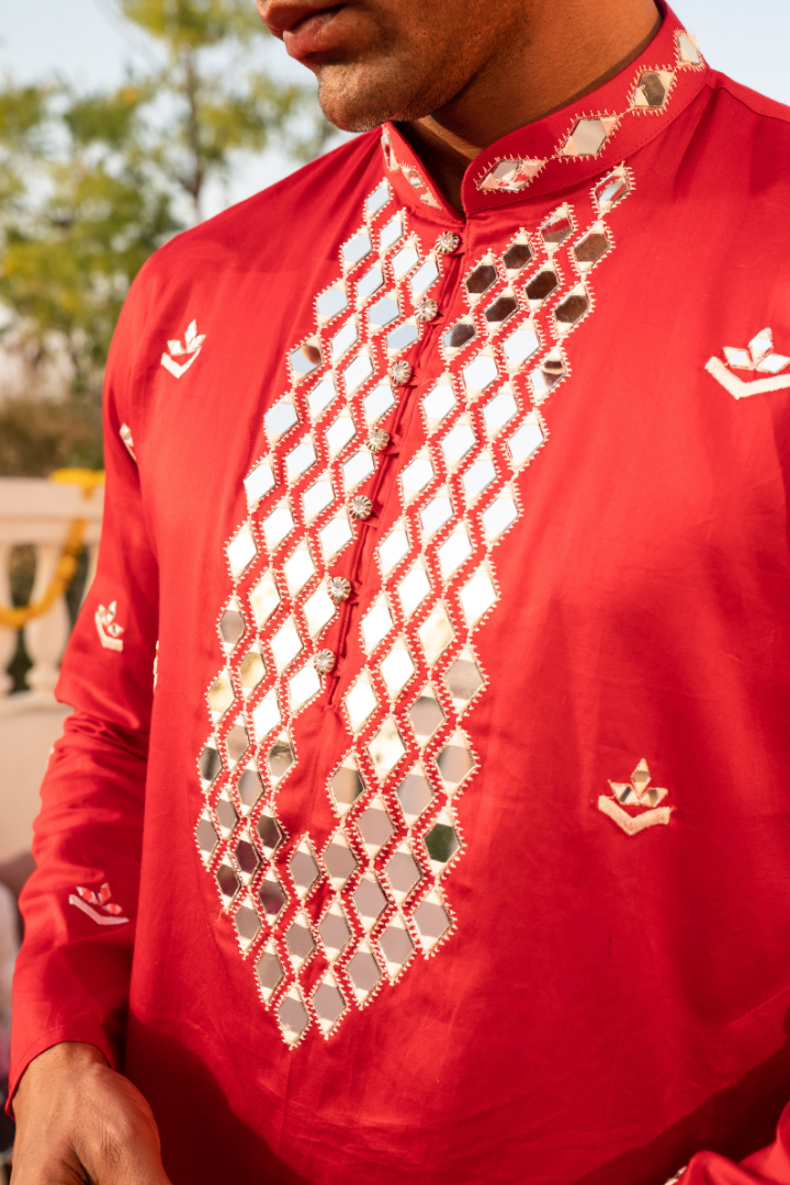 Embrace cultural richness with this sindoor red kurta embellished with dazzling kanch work. The auspicious red hue is beautifully complemented by the shimmering mirror embellishments, creating a traditional yet glamorous look.