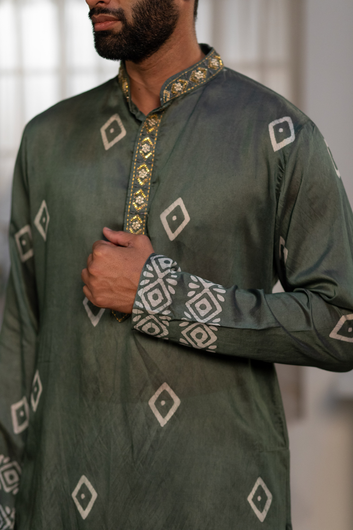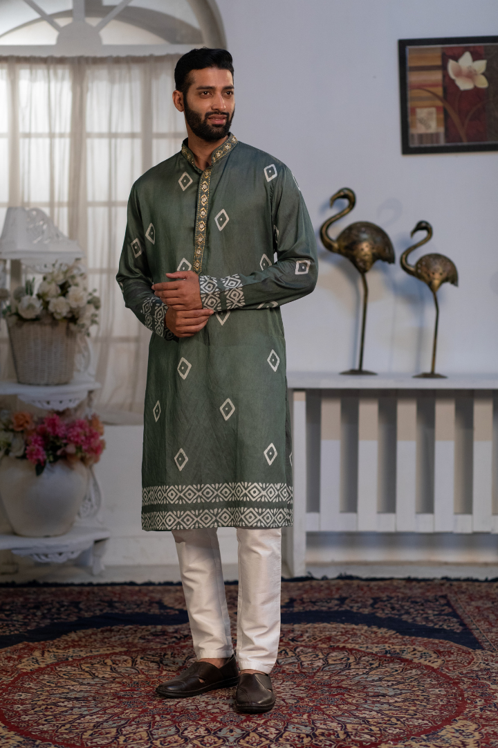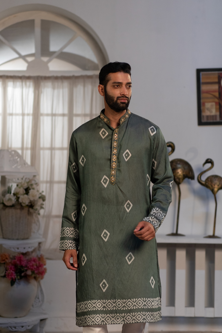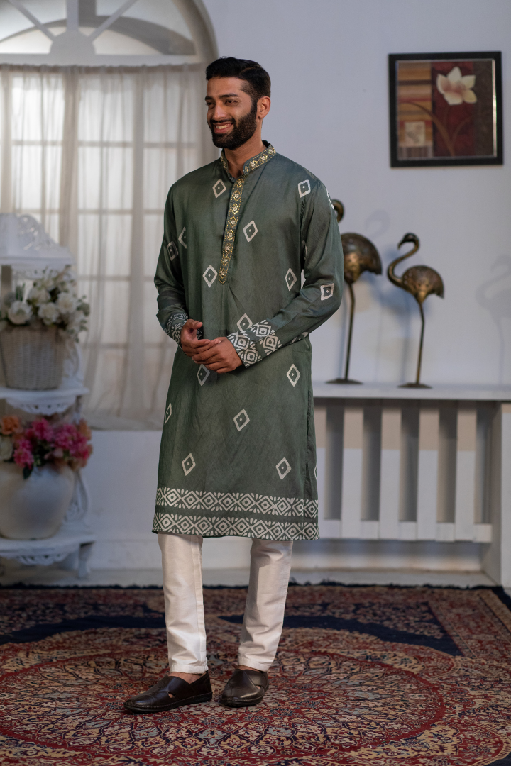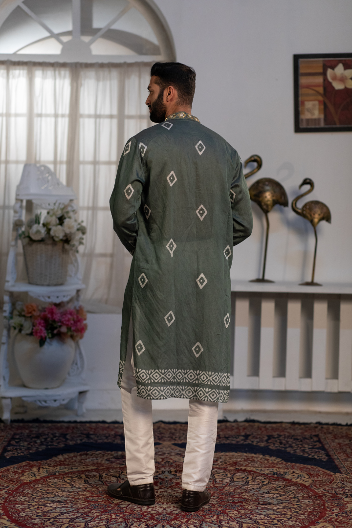 A traditional kurta with batik prints on bottle green Chanderi silk. The avocado shade adds depth to the heritage design.