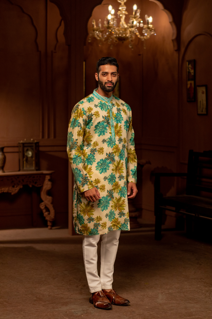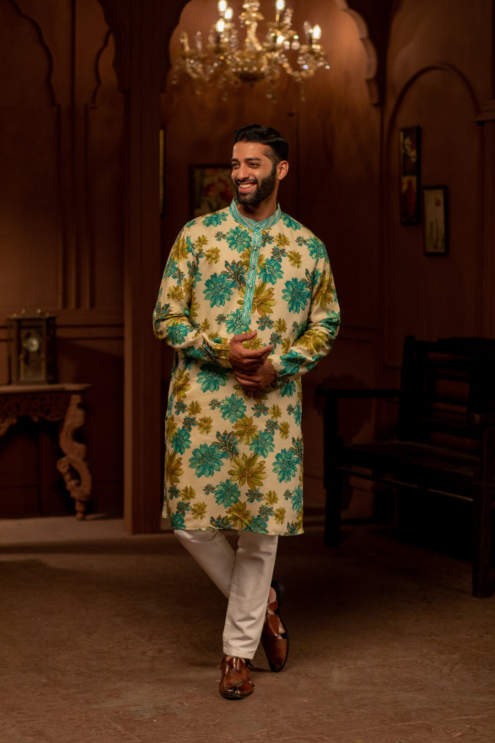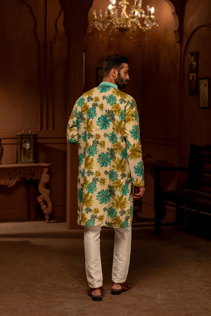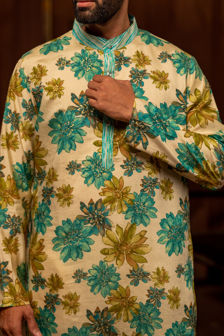 A luxurious kurta combining beige and cerulean in an enchanting floral pattern. The modal cotton satin provides a smooth finish with subtle sheen.