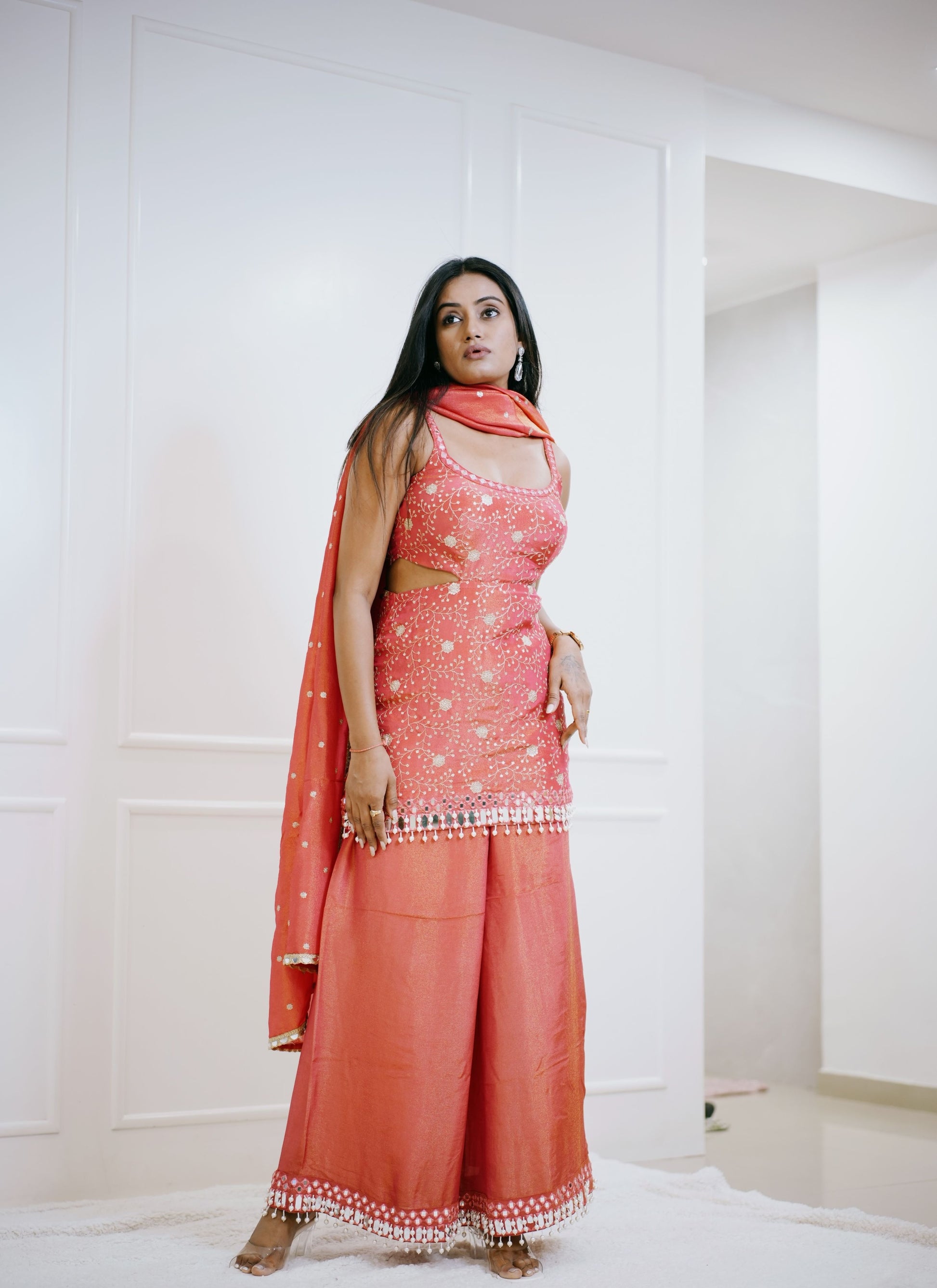 Alaya Mehfil Crimson Kurta Sharara Set comes with a deep red kurta and sharara bottoms. The sharara is broad and moves easily as you walk. Made of mal cotton, the fabric is light and easy to wear for hours. The kurta sits well without being tight. This outfit is suitable for weddings, festive occasions, or family functions. Pair with flats or sandals. Simple earrings complete the style.
