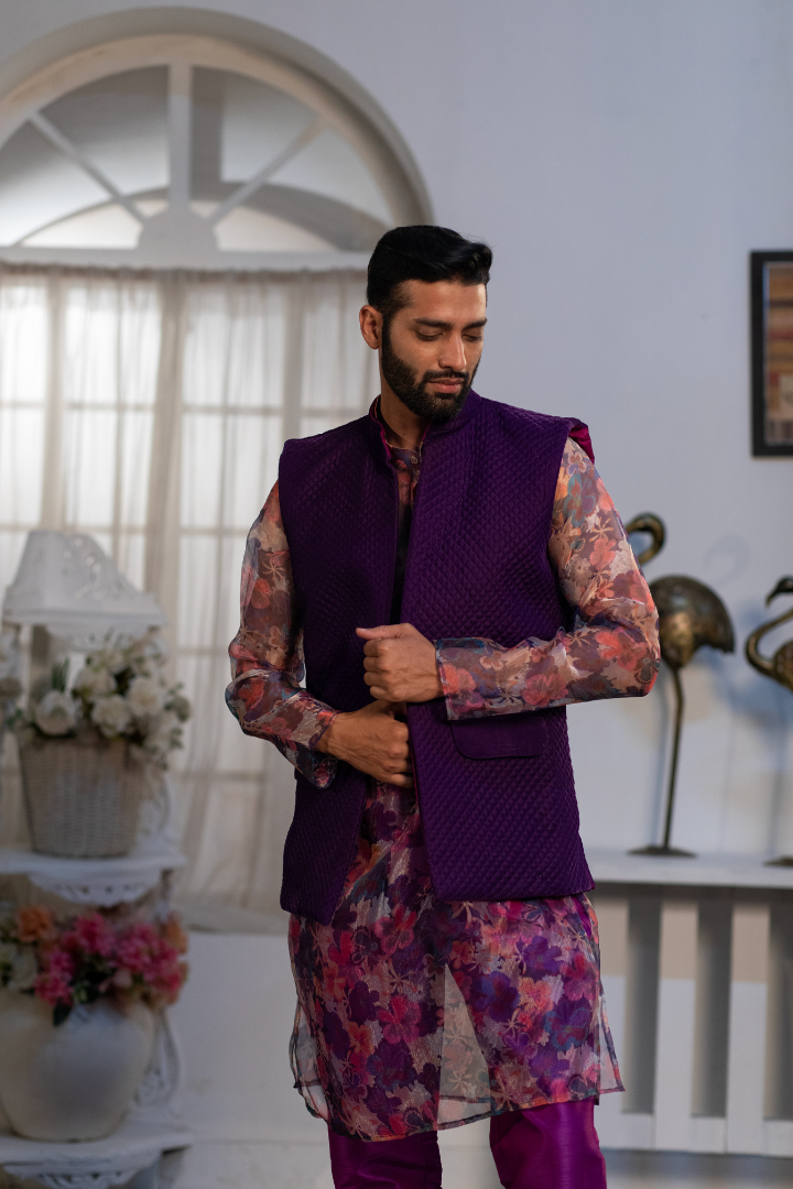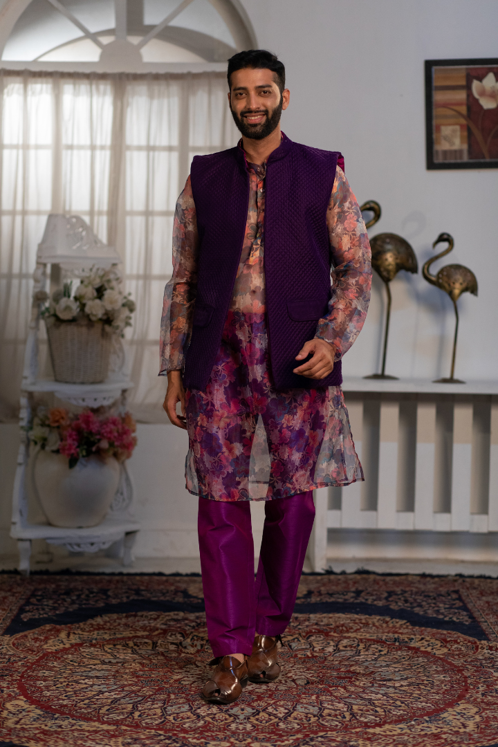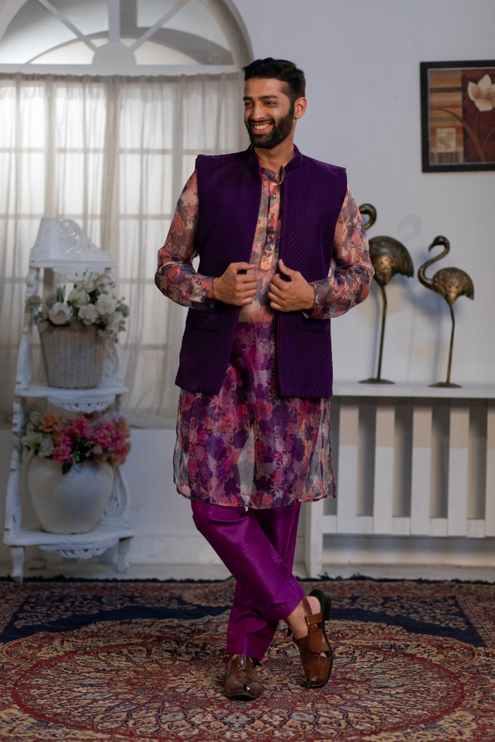 A luxurious three-piece set featuring organza kurta, velvet jacket, and silk pants. The Chinese violet shade creates royal appeal.