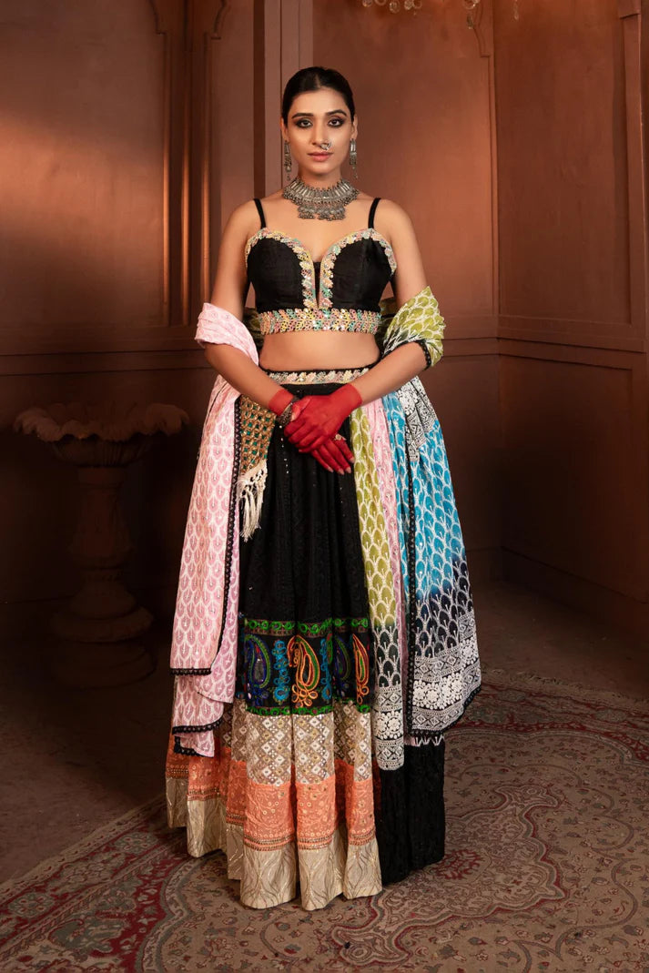 Bloom with elegance in our Chocolate Sunflower Lehenga. This stunning ensemble features a rich chocolate hue adorned with sunflower motifs, crafted from a luxurious blend of silk and georgette. It's the perfect choice for those seeking a unique and sophisticated look.