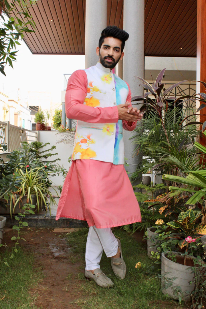 This exquisite cotton silk kurta for men features intricate embroidery work around the neck and a beautiful multiprint basecoat. The combination of the delicate embroidery and bold multiprint design creates a stunning contrast that is sure to catch the eye. Made from high-quality cotton silk fabric, this cotton kurta is lightweight and breathable, making it comfortable to wear for long periods.