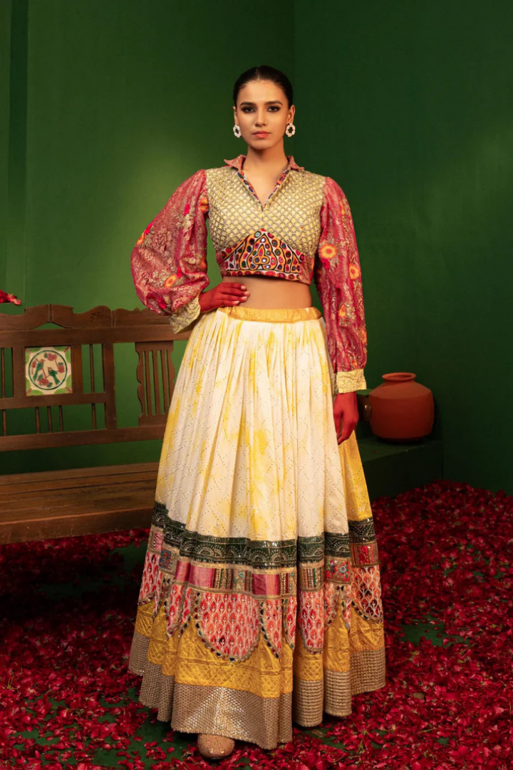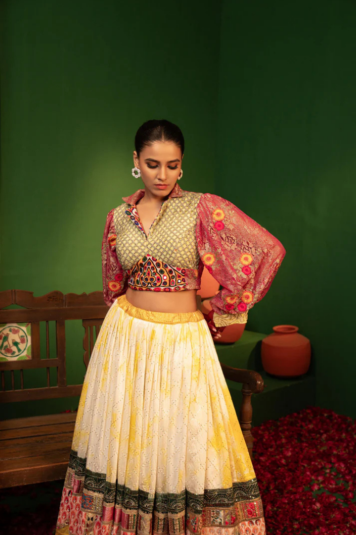 Devi Aloka Yellow Batik Lehenga with Chanderi Silk and Silk Blouse