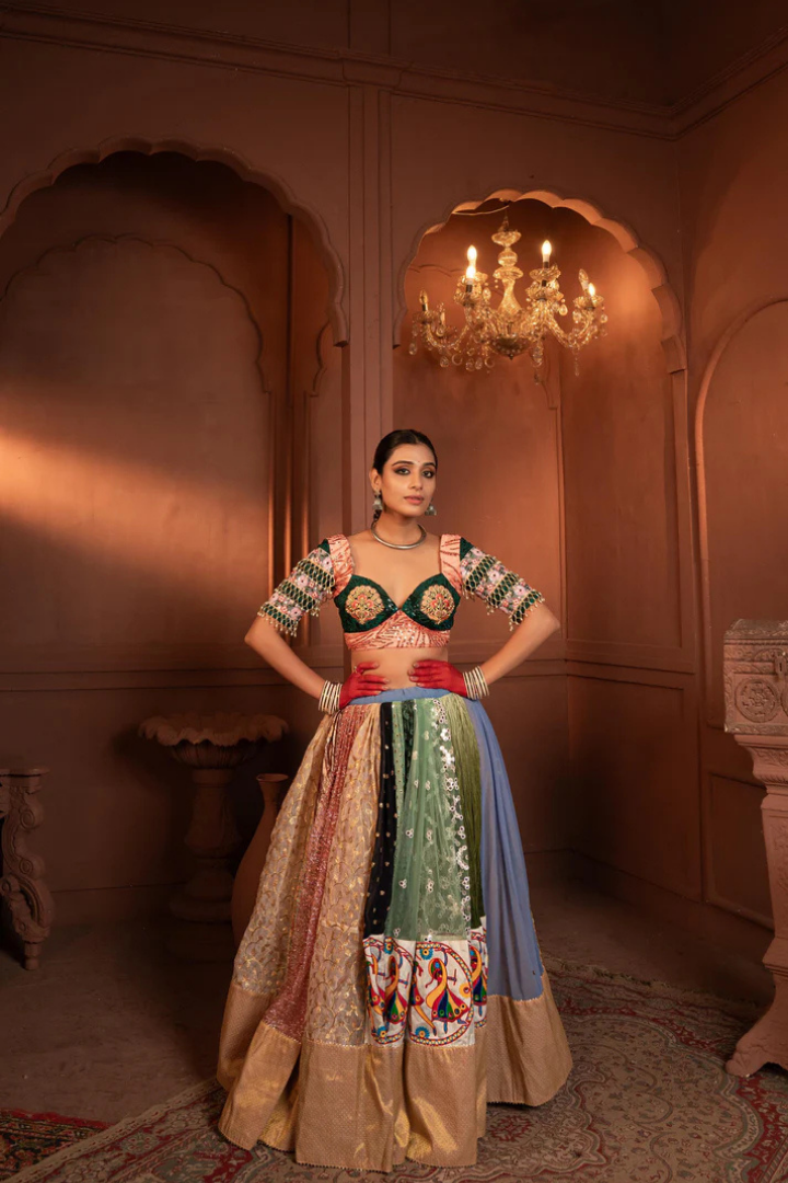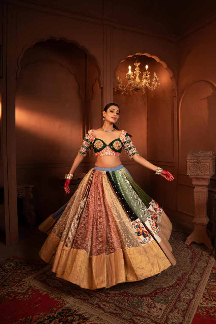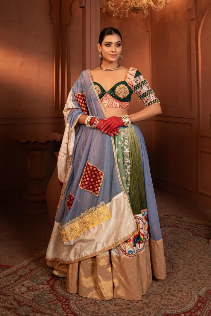 Experience the grace of Inayat with this stunning Devi lehenga. Crafted from a luxurious blend of silk and georgette, this ensemble offers a perfect balance of structure and flow, making it ideal for special occasions.