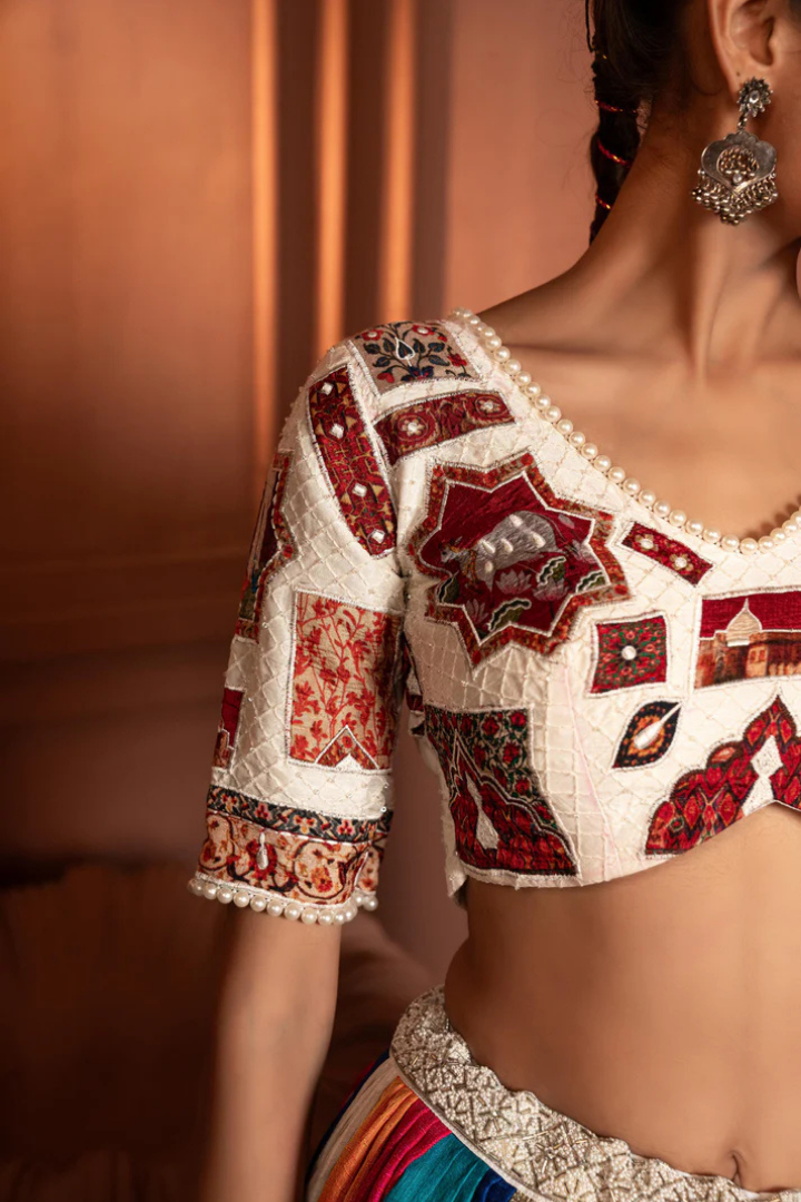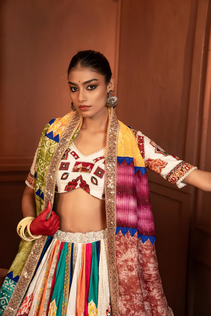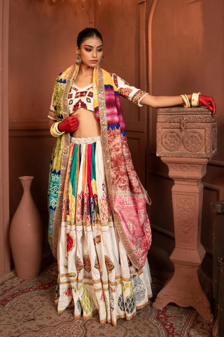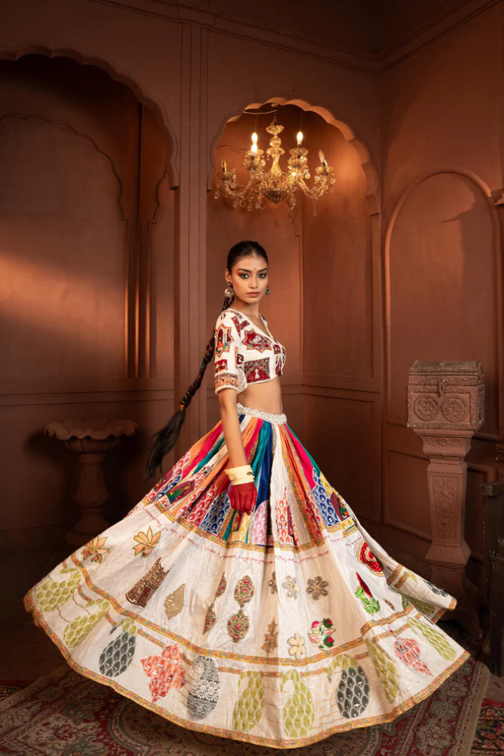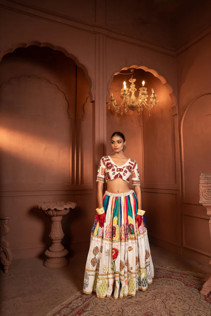 Devi White Emerald Allover Patch Work Silk Lehenga