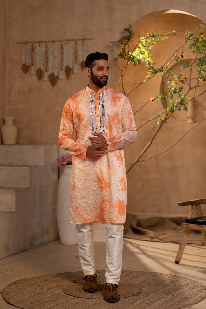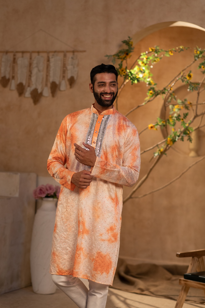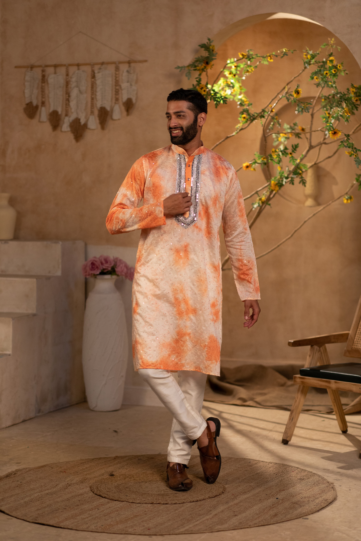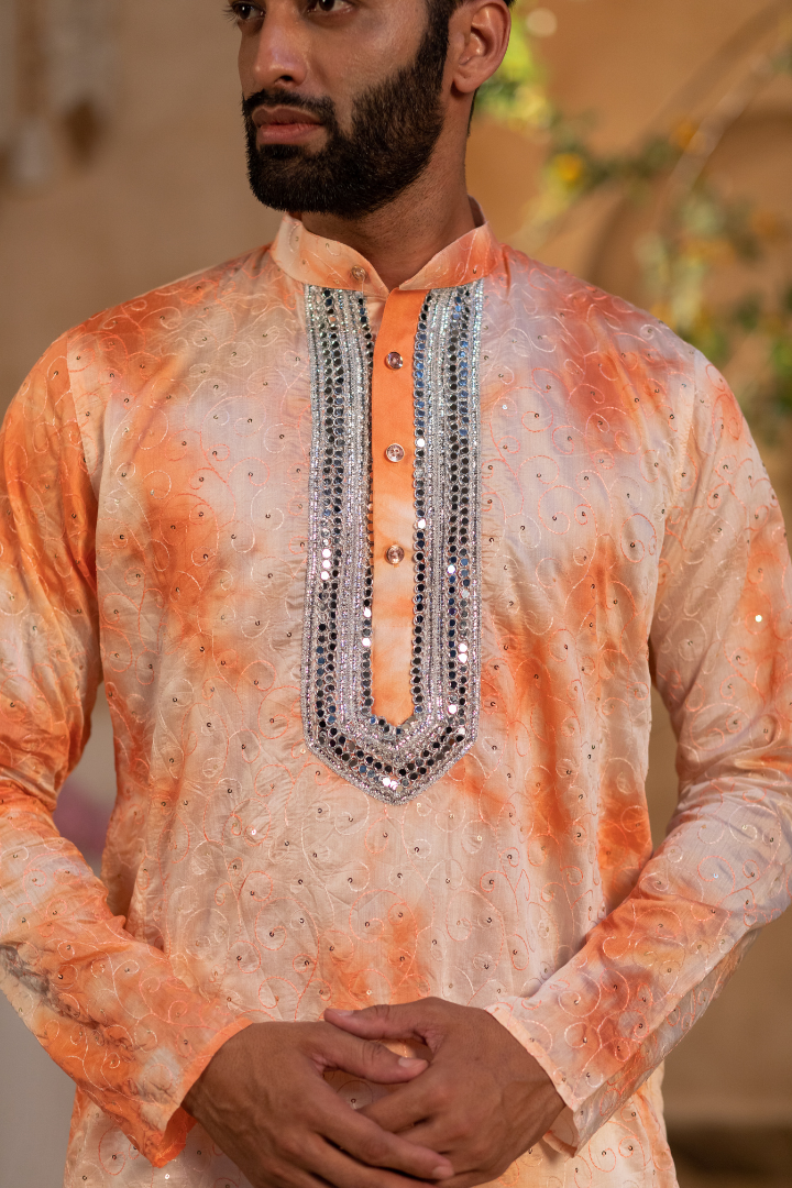 A striking kurta in Dior orange with silver border details. The Chanderi silk adds traditional elegance to the design.