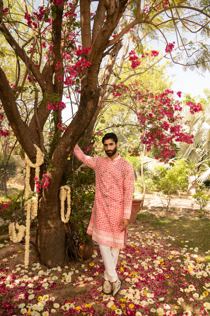 This exquisite kurta showcases the beauty of shibori dyeing in a soft pink pearl hue. Each piece features unique patterns created by the traditional Japanese tie-dye technique, making it a true work of art.