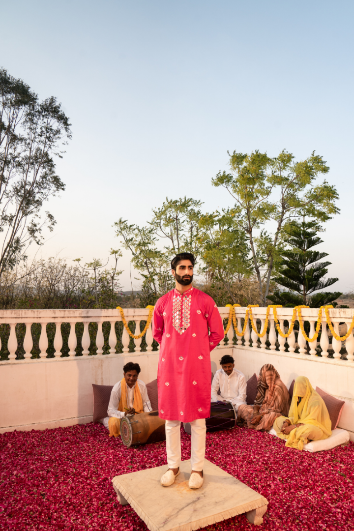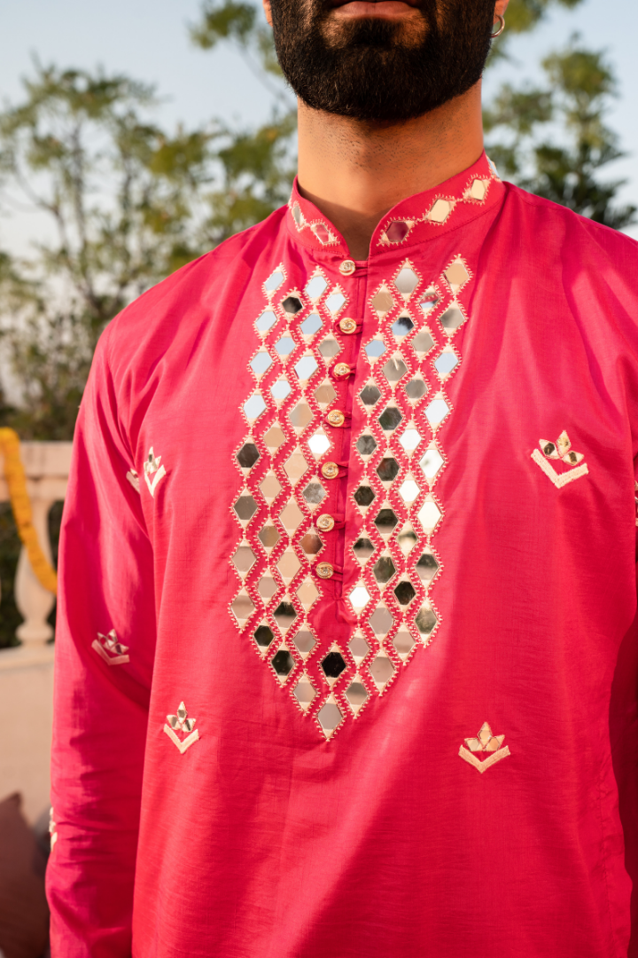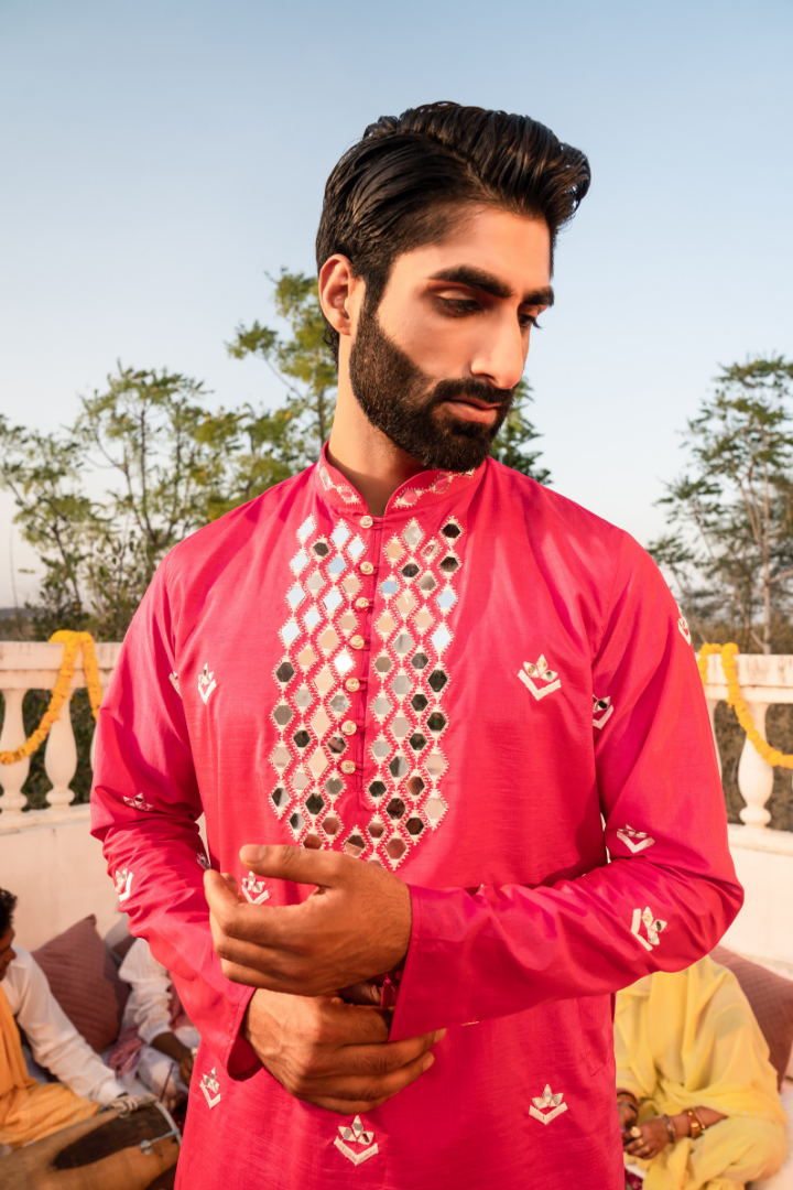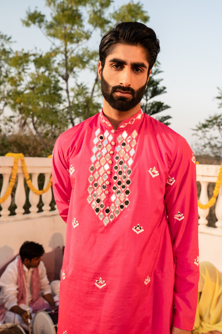 Make a statement in this bold fuscia pink kurta featuring eye-catching kanch embellishments. The energetic pink hue is perfectly balanced by the sparkling mirror work, creating a look that's both vivacious and elegant.