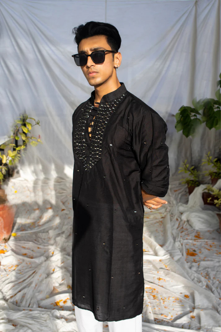 Handcrafted Black Silk Kurta with Yoke Mirror Work