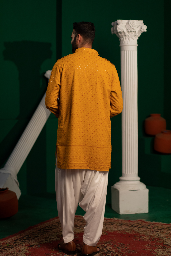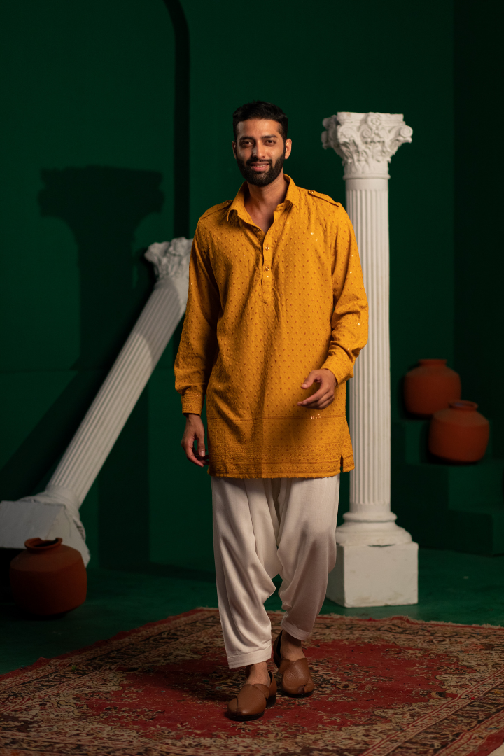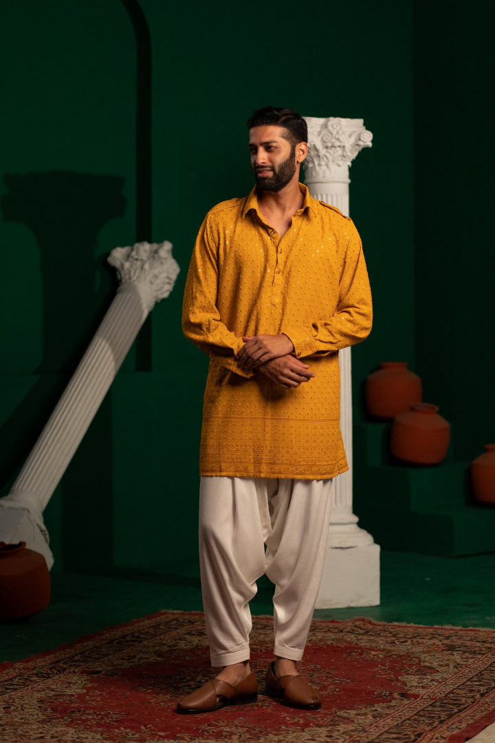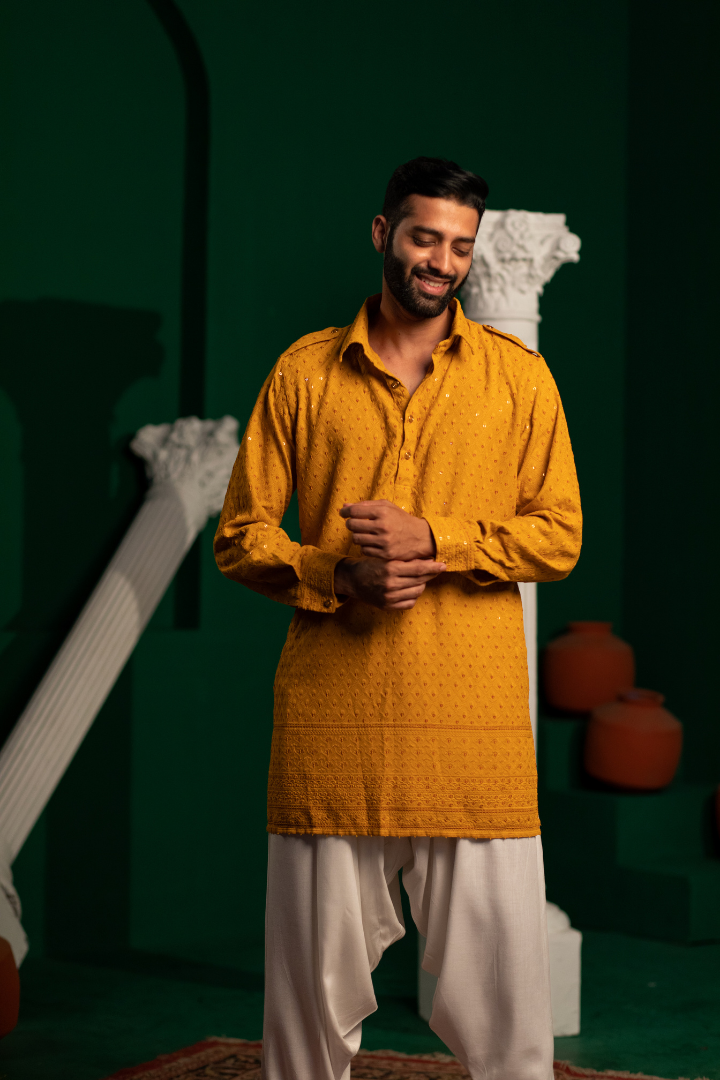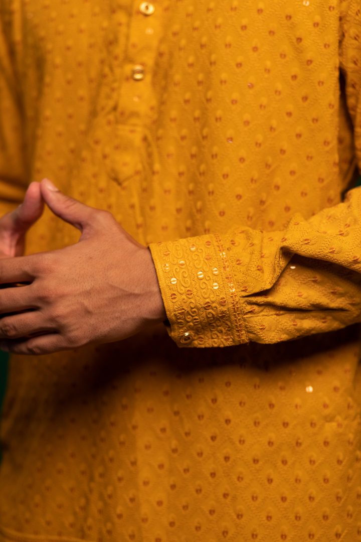 - A coordinated set featuring sequin work on mustard kurta with matching Patiala salwar. The rayon cotton ensures comfort and flow.