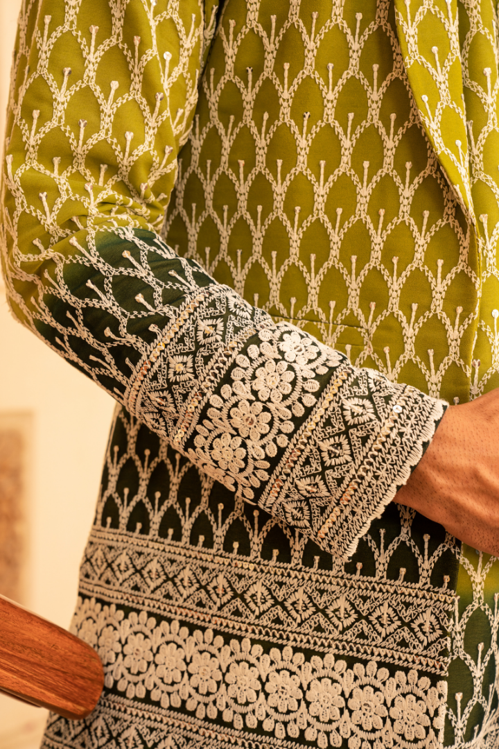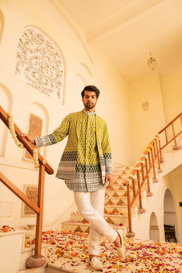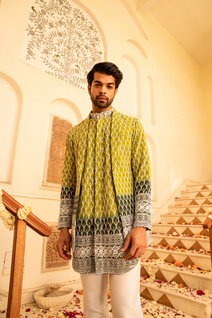 Embrace the beauty of nature with this jungle green shaded indowestern outfit. The garment features a stunning gradient that evokes the lush depths of a tropical forest, transitioning from deep emerald to lighter lime hues.