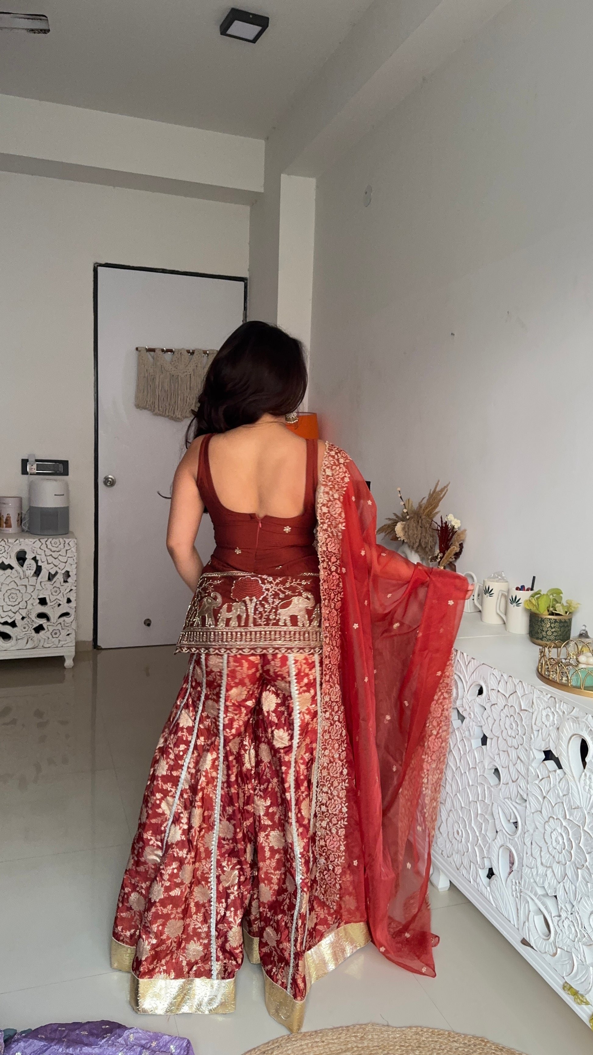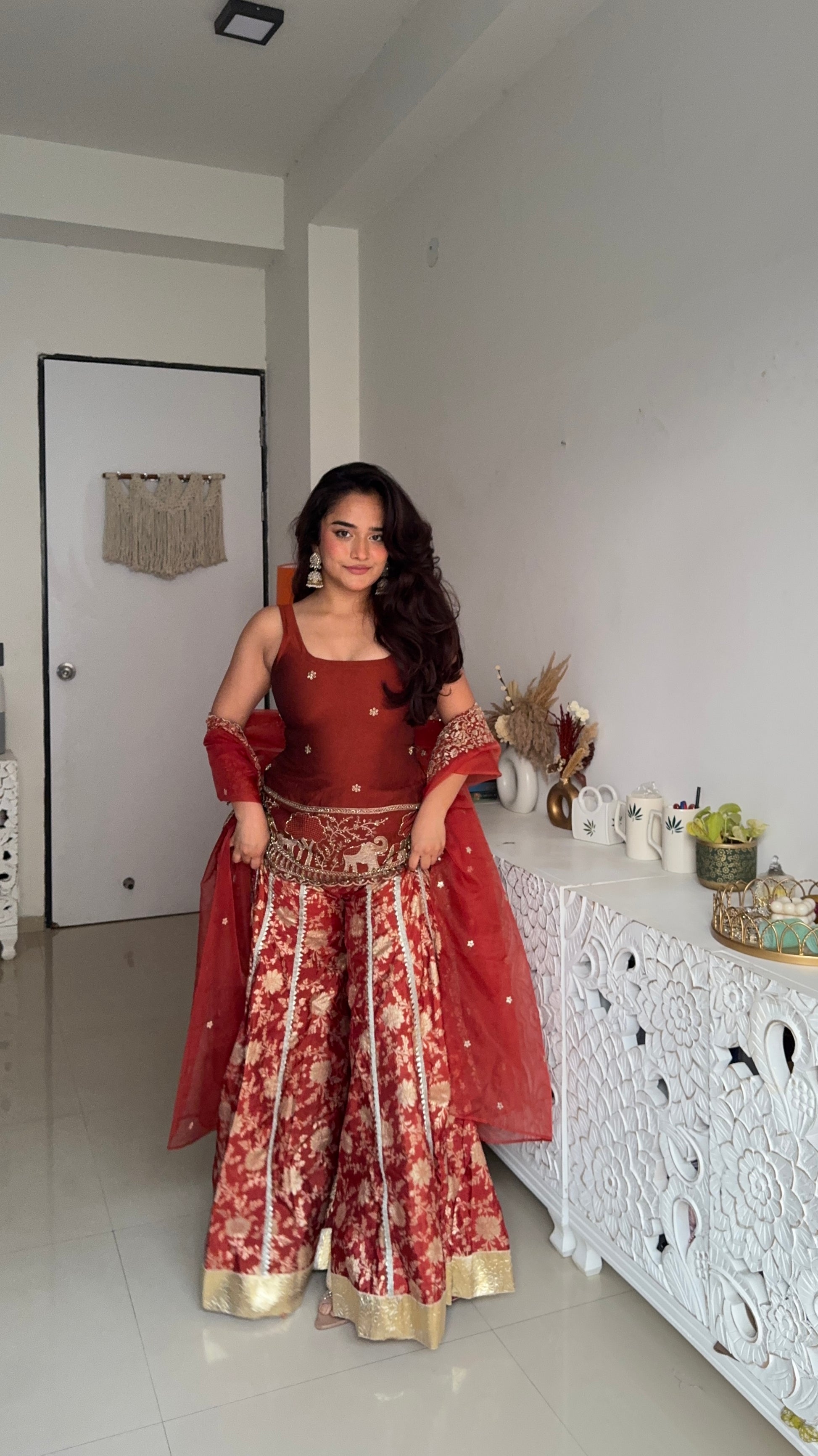 Elevate your festive wardrobe with our Mehru Rust Silk Plazzo Set, crafted in luxurious Silk in a rich rust orange hue that radiates warmth and elegance. Featuring a beautifully detailed kurta paired with a flowy plazzo and a graceful dupatta, this ensemble blends traditional charm with contemporary comfort.