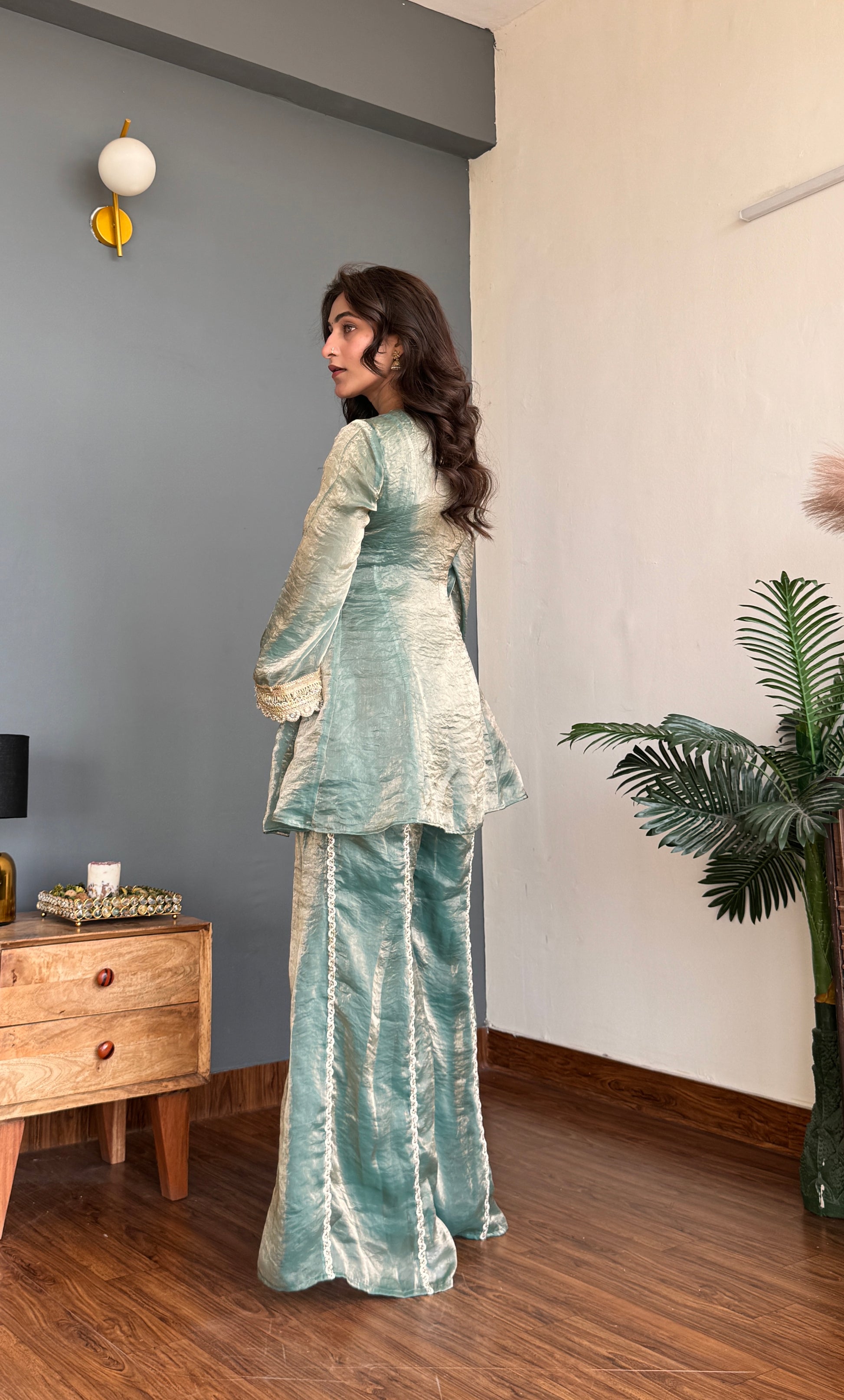 The Mint Mirror Masti Co-ord Set is a playful take on contemporary festive wear. Crafted in a soothing mint hue, the ensemble features a flared embroidered top adorned with quirky mirror detailing, paired with fluid palazzo pants for effortless movement. Perfect for festive brunches, mehendi celebrations, and statement day events, this set blends comfort, charm, and artisanal elegance with a distinctly modern vibe.