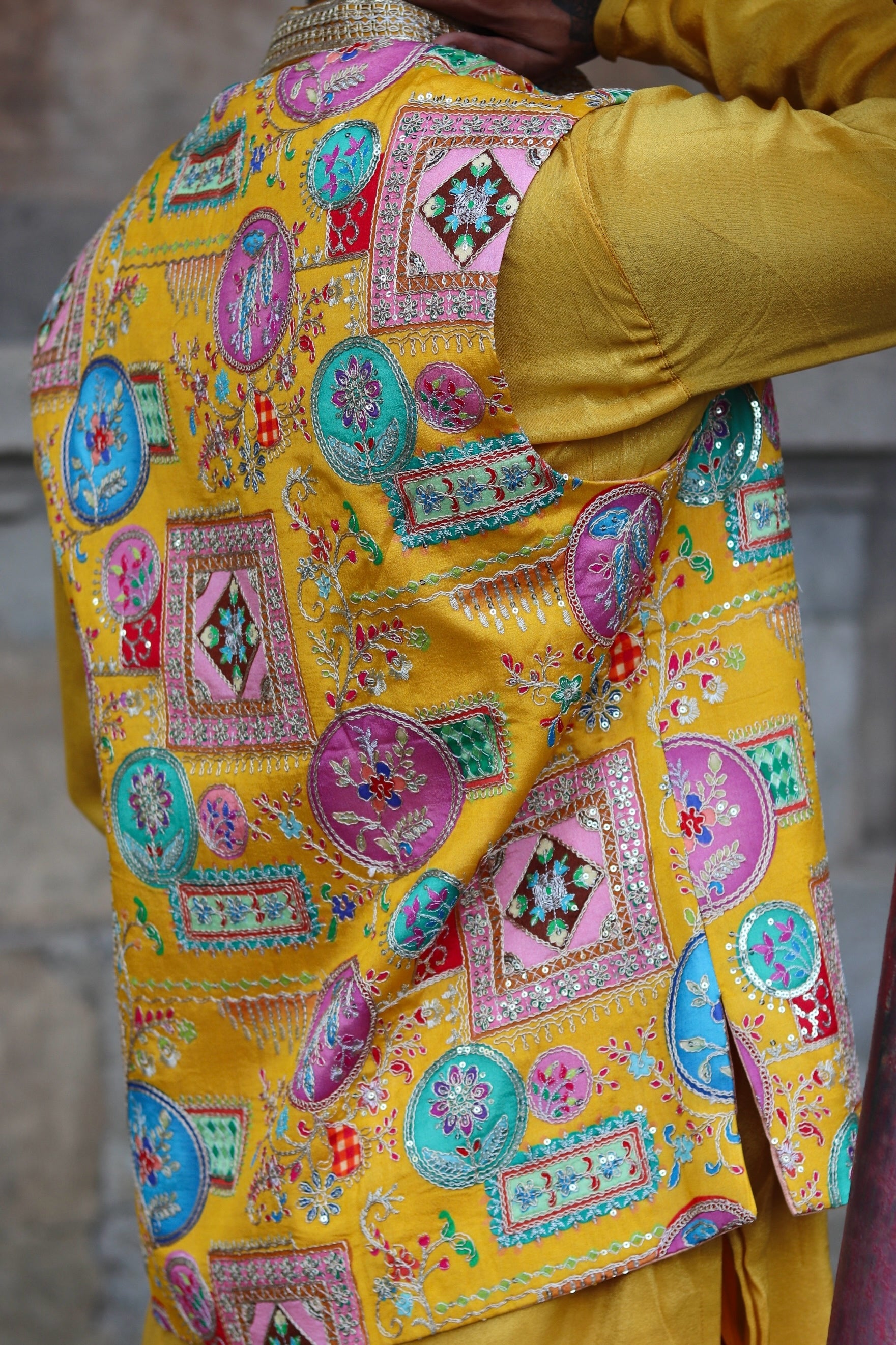 Multi Coloured Embroidery Work On Yellow Koti , Kurta And Pant