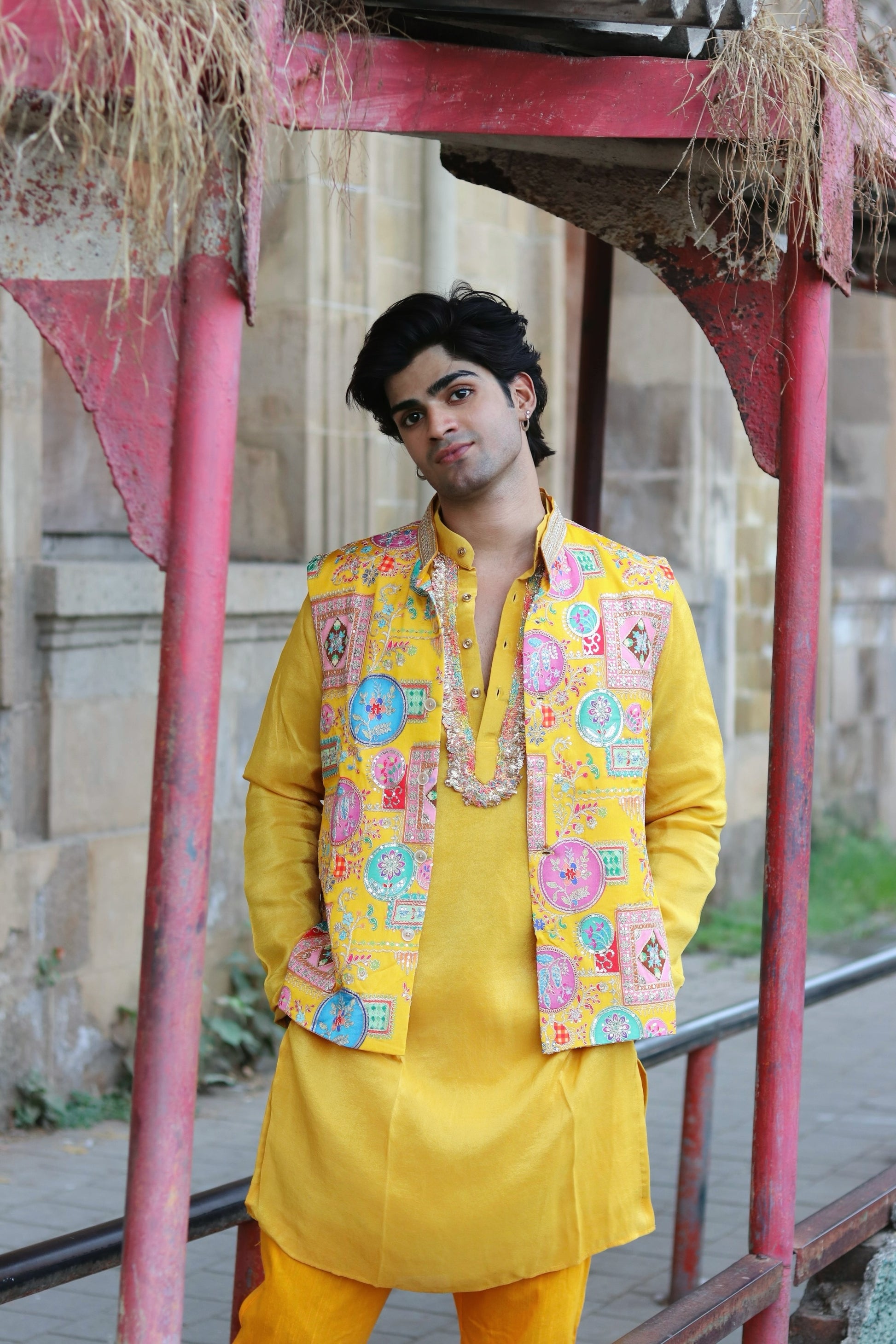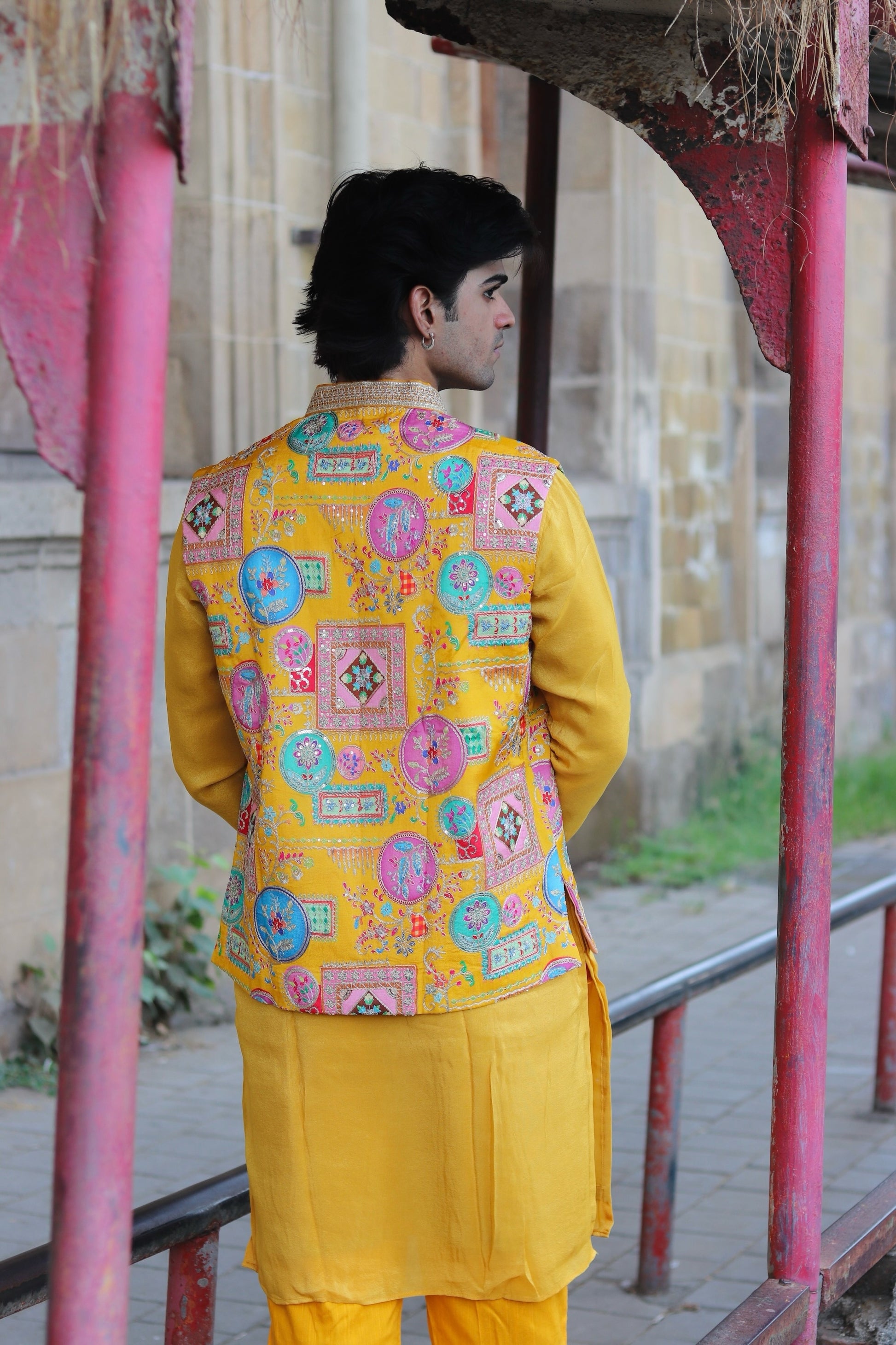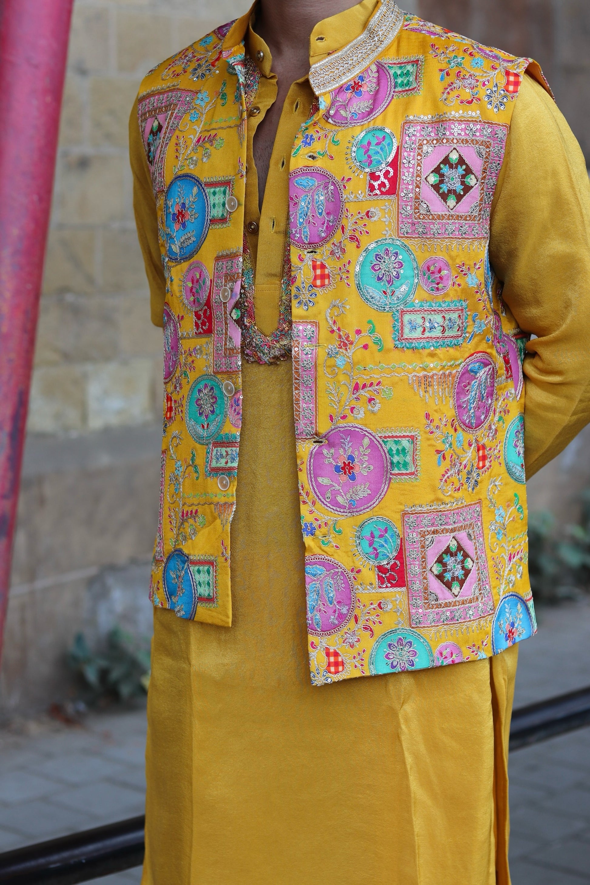 Men’s yellow koti, kurta, and pant set