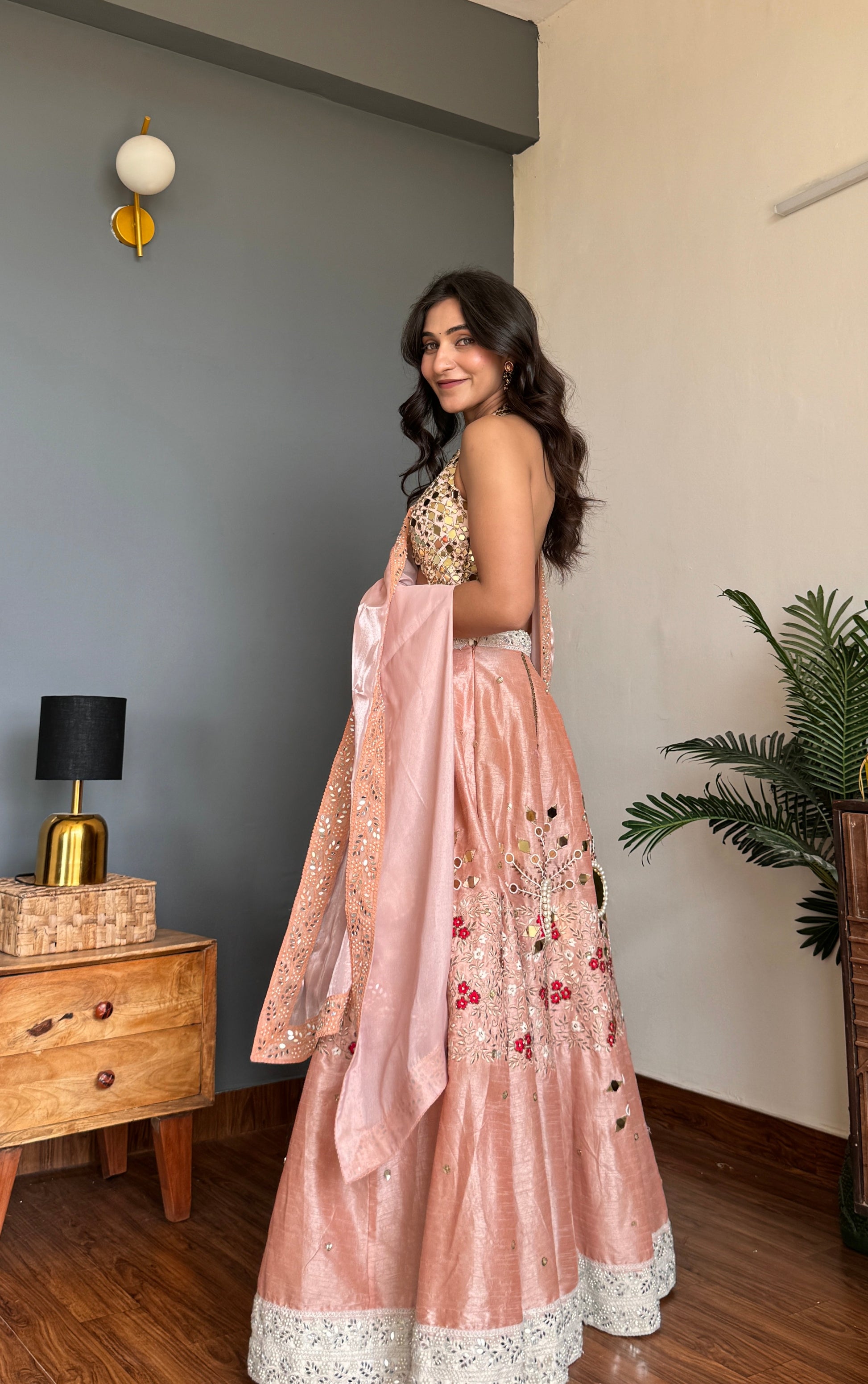 Kaleji Rose Gold Silk Kurta Set with Organza Lehenga and Dupatta