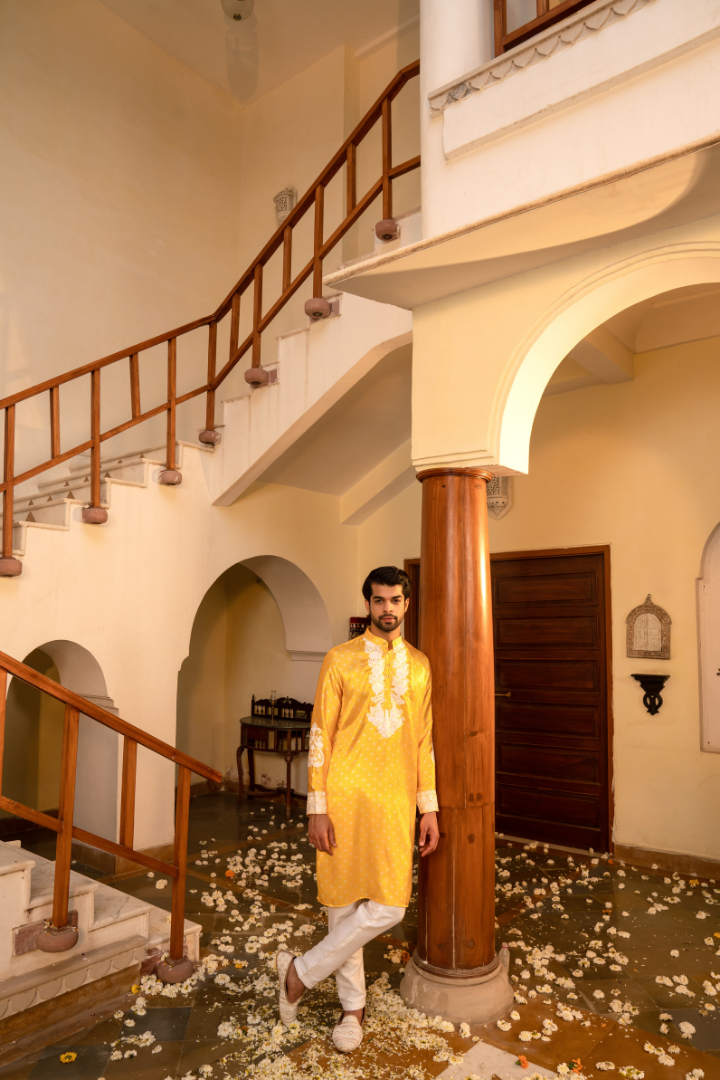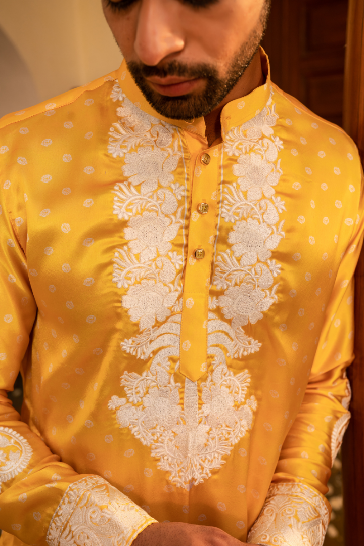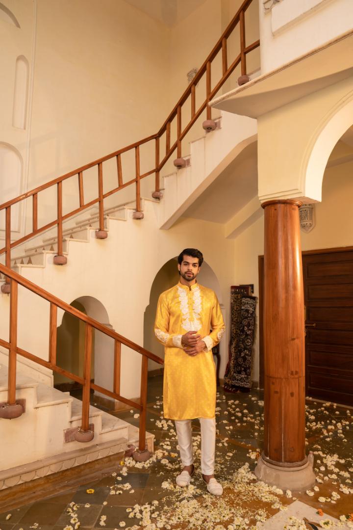 Embrace the essence of summer with this jasmine yellow bandhani kurta adorned with white embroidery. The sunny yellow hue is decorated with classic bandhani patterns and enhanced by intricate white embroidered details.