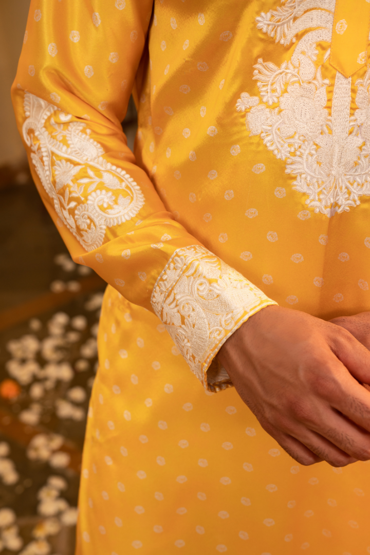Radiant Jasmine Yellow Bandhani White Embroidery Kurta
