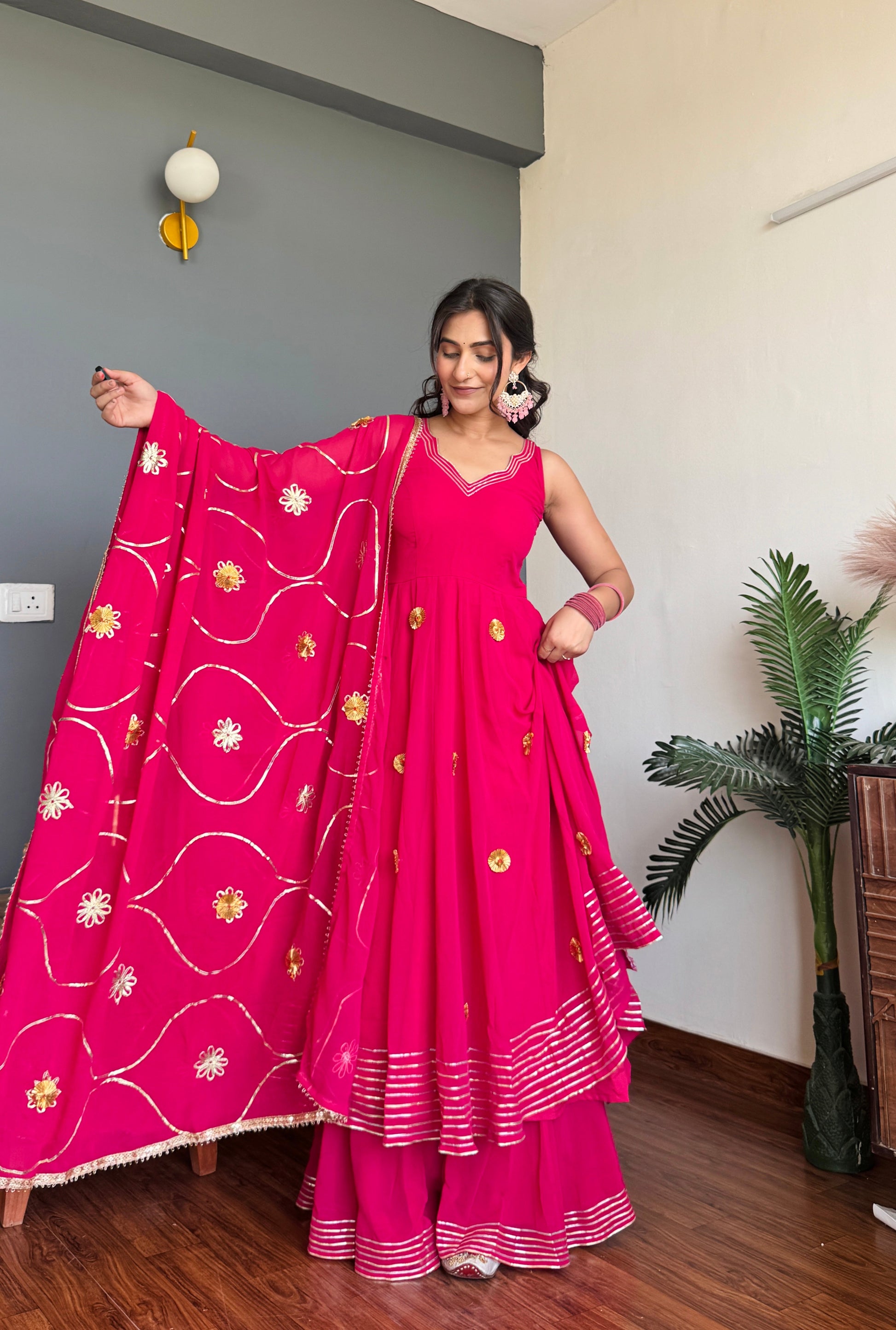 Rani Princess Anarkali is made from georgette in a soft pink shade. It has embroidery that adds detail without weight. The dress has a gentle flare that moves easily when you walk. The fabric is light and feels easy to wear for hours.