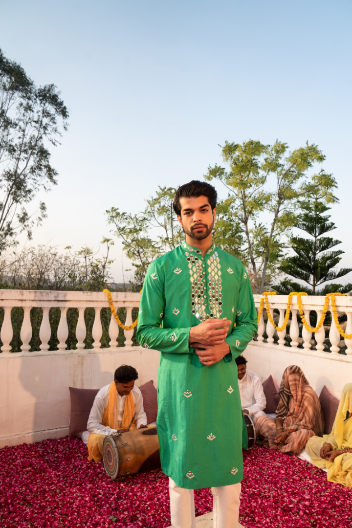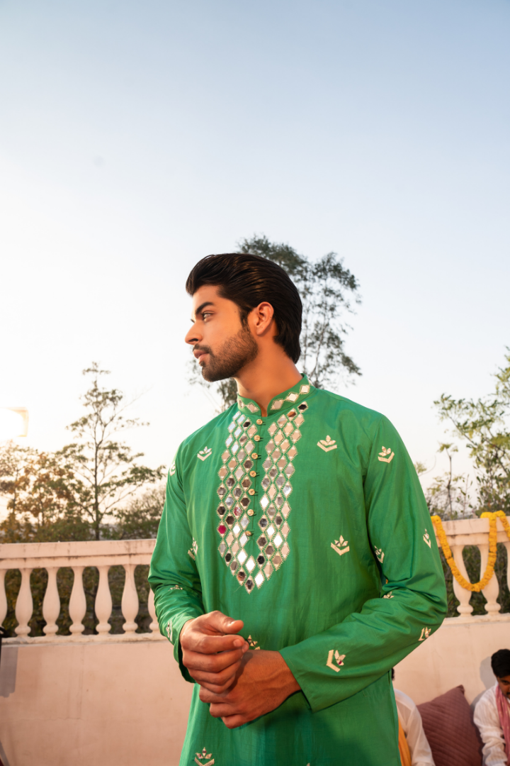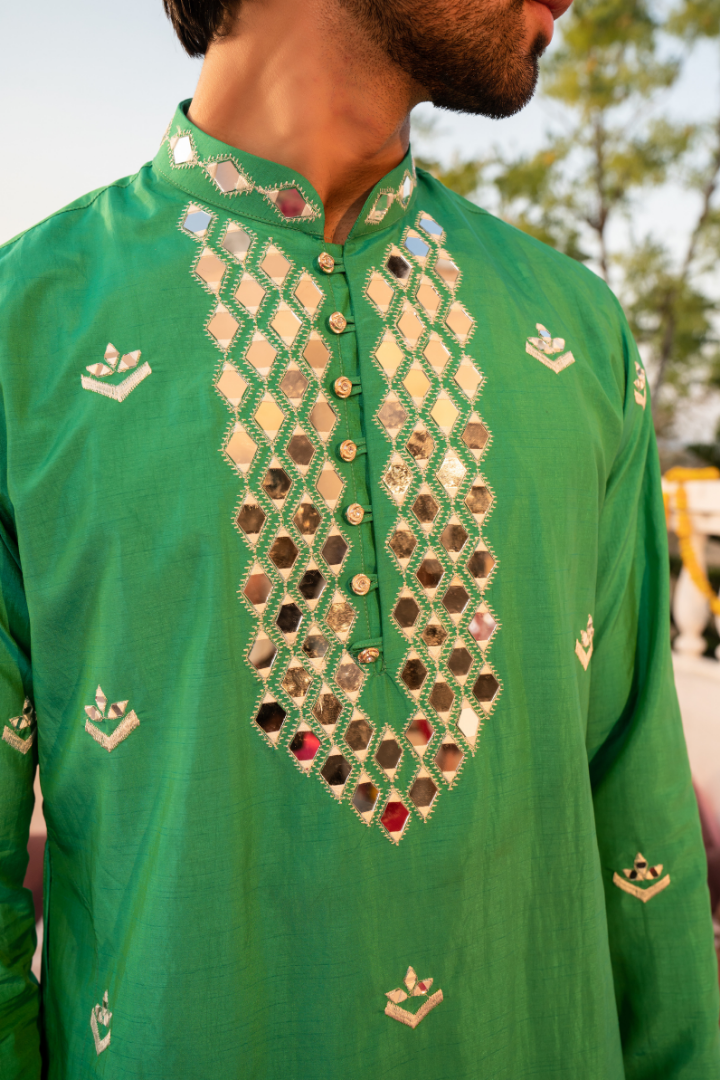 Channel royal sophistication with this emerald green kurta adorned with lustrous kanch work. The rich jewel tone provides a luxurious backdrop for the intricate mirror embellishments, resulting in a truly majestic garment.