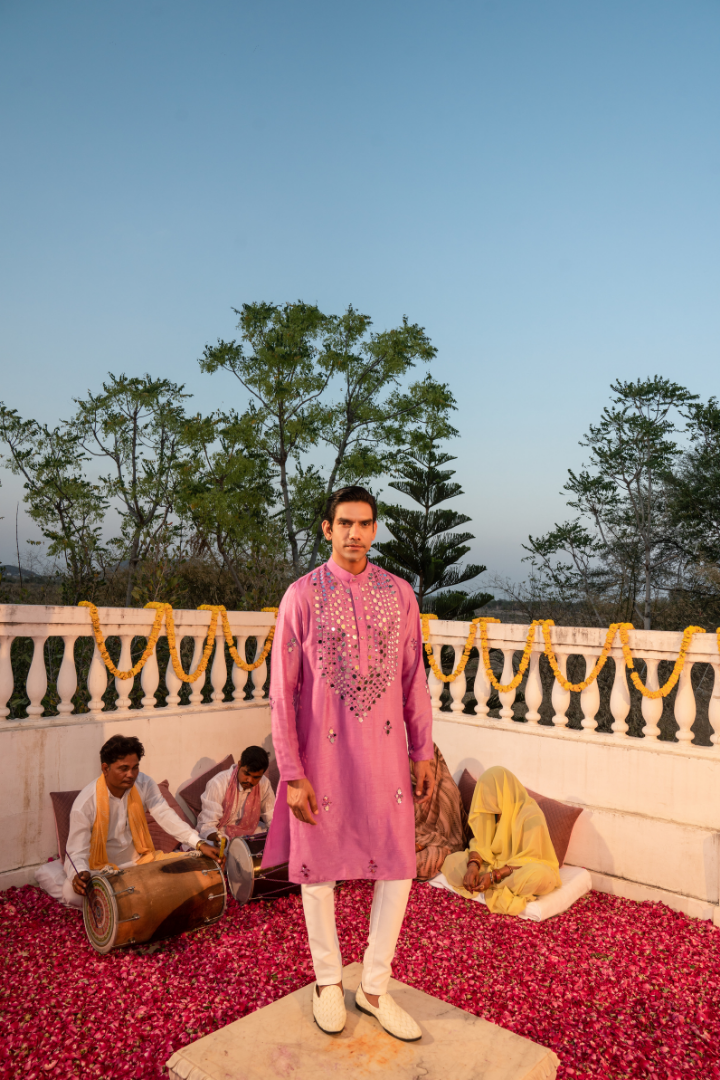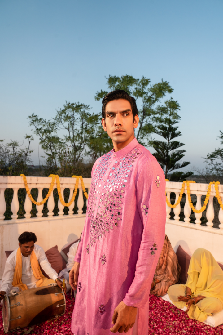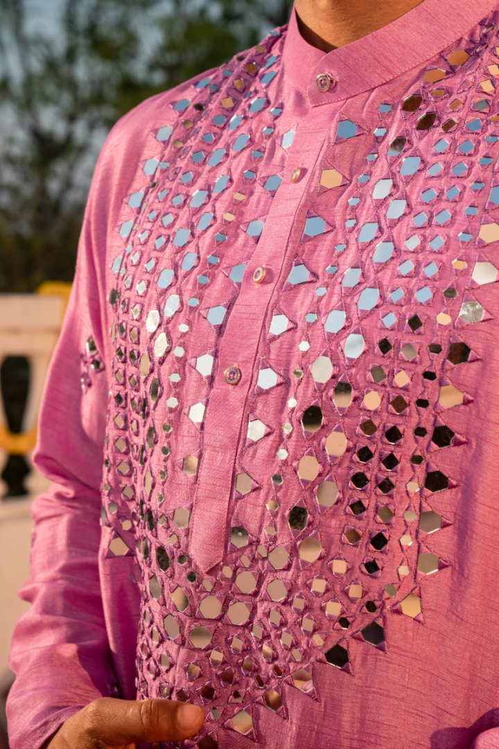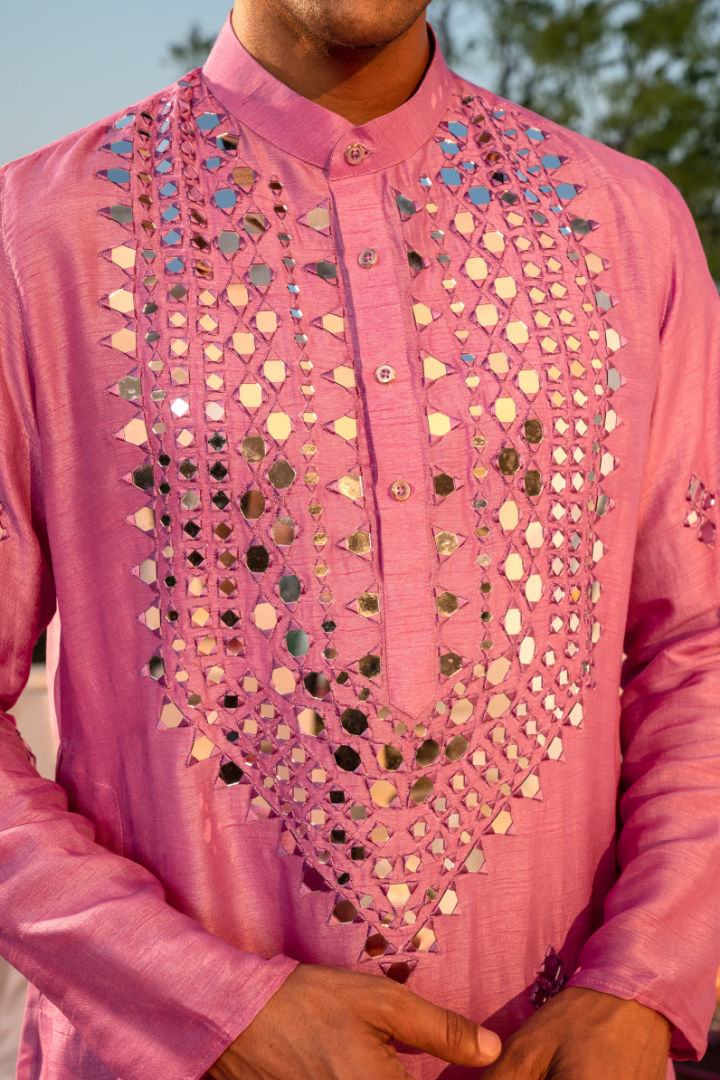 Indulge in royal sophistication with this medium violet kurta embellished with dazzling mirror work. The luxurious purple hue serves as a stunning backdrop for the shimmering mirror embellishments, creating a look of unparalleled elegance.