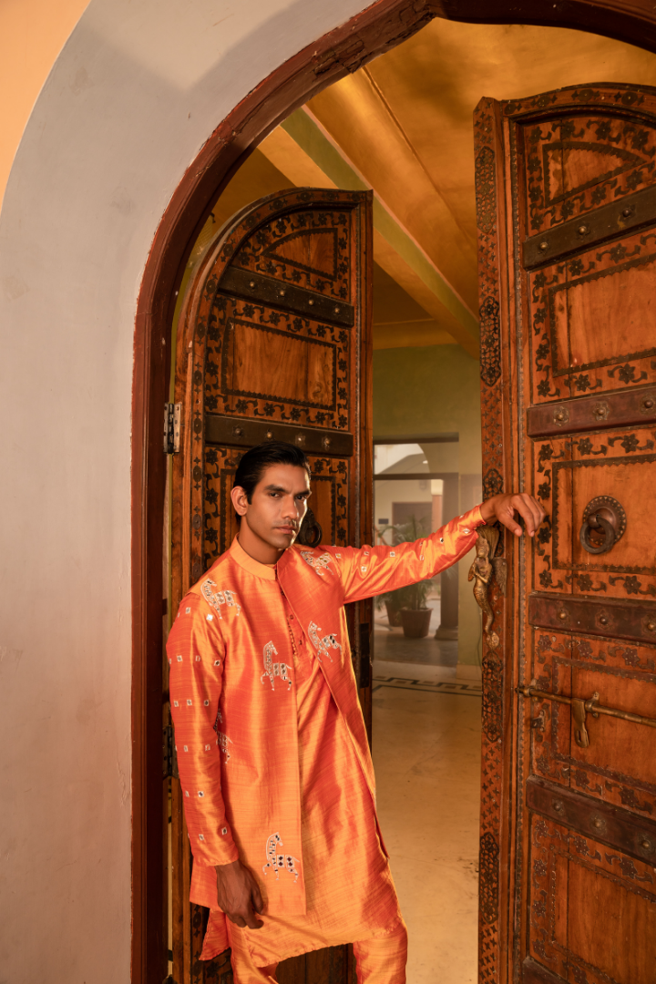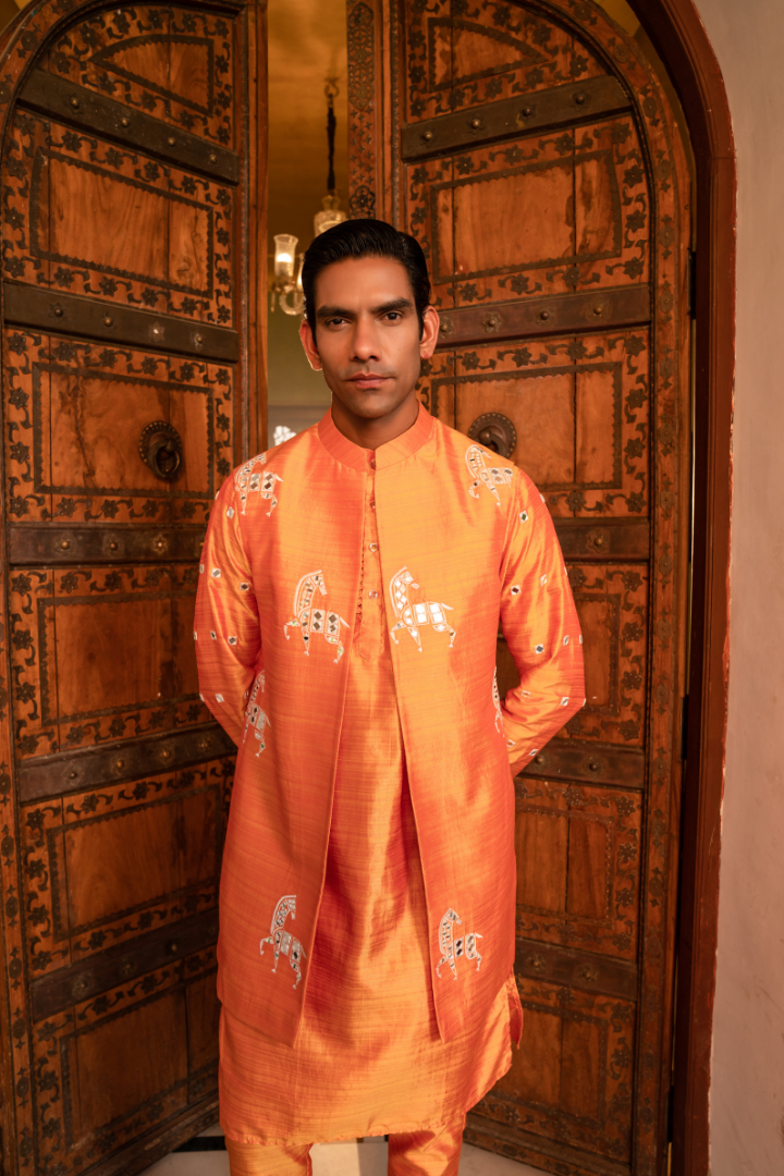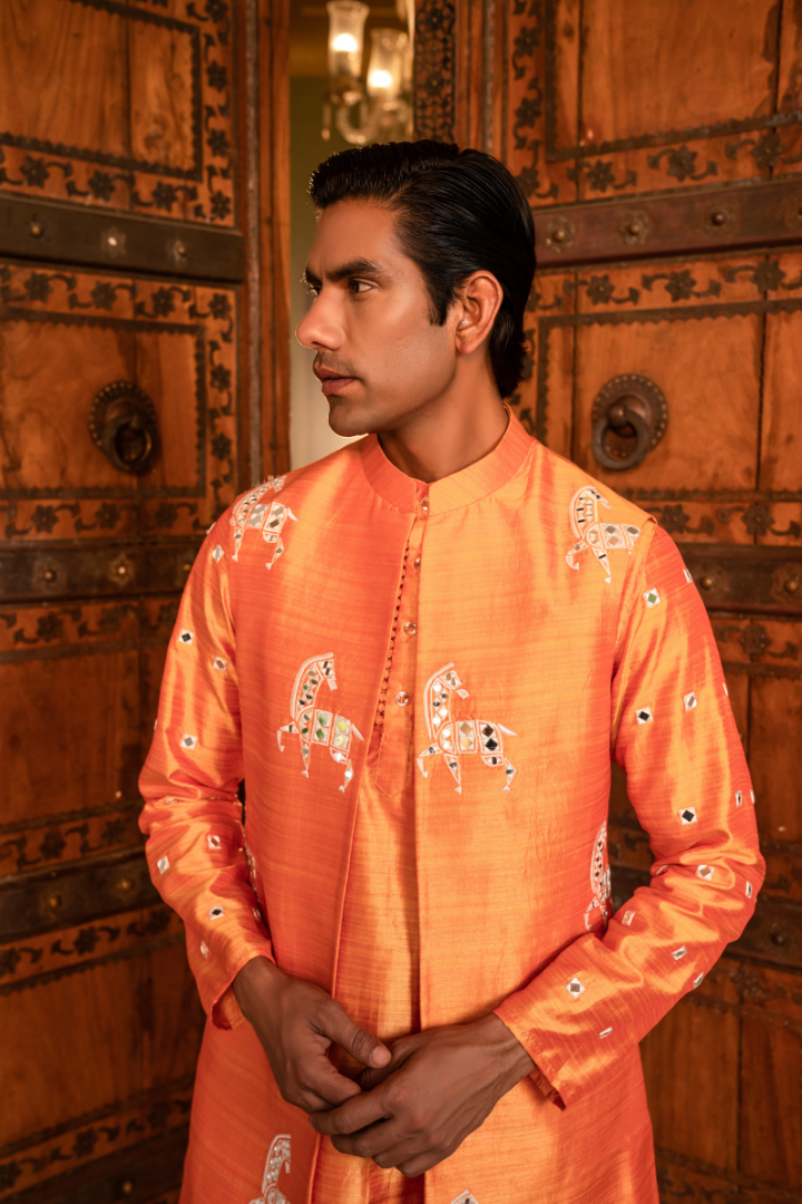 Make a grand entrance in this opulent metallic gold indowestern piece featuring elegant horse motifs. The shimmering gold fabric and equestrian-inspired design elements combine to create a look of unparalleled luxury and regality.