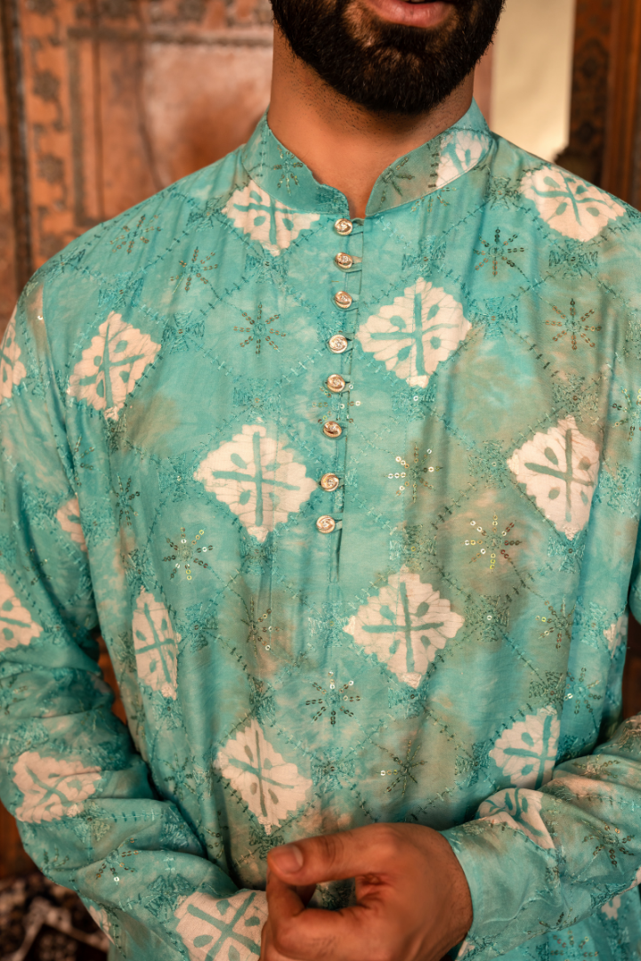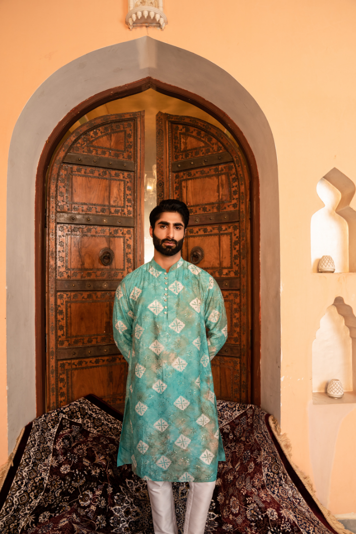 Find your inner peace with this soothing jade blue batik kurta. The tranquil blue hue is enhanced by delicate batik designs, creating a garment that's both visually interesting and deeply calming.