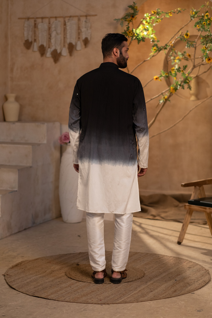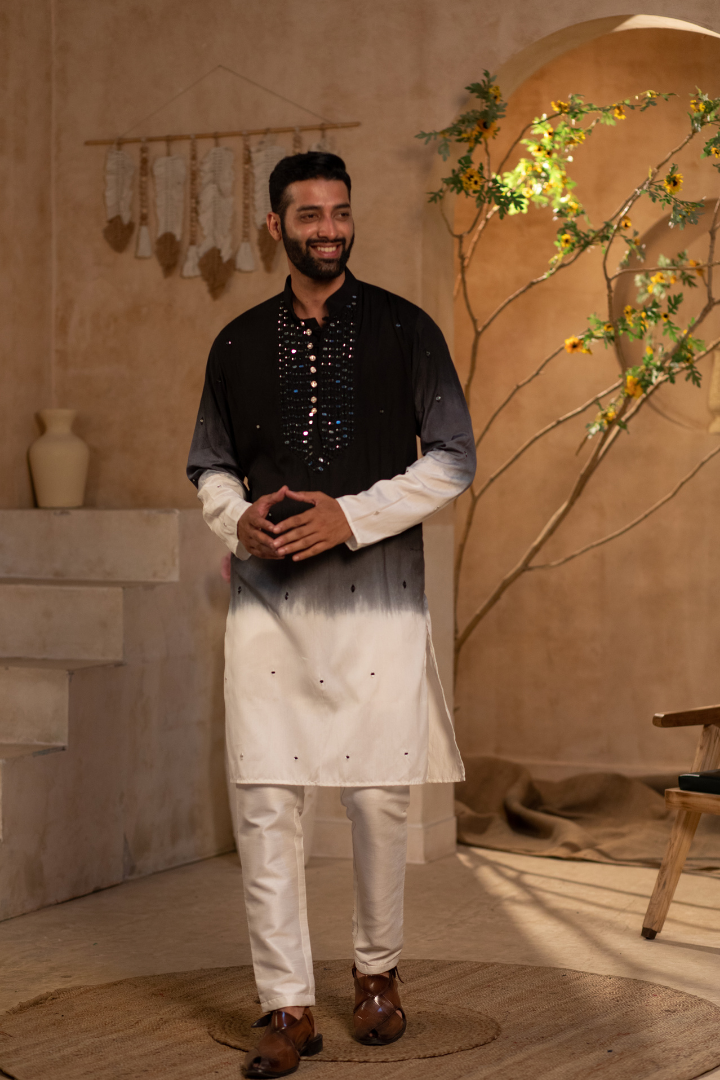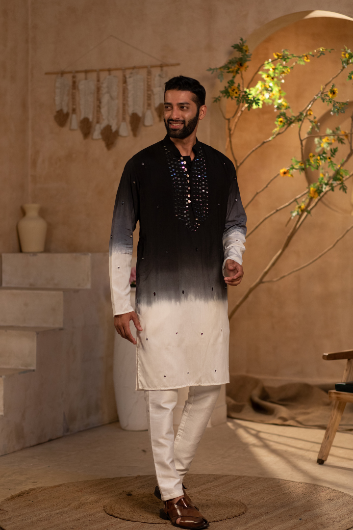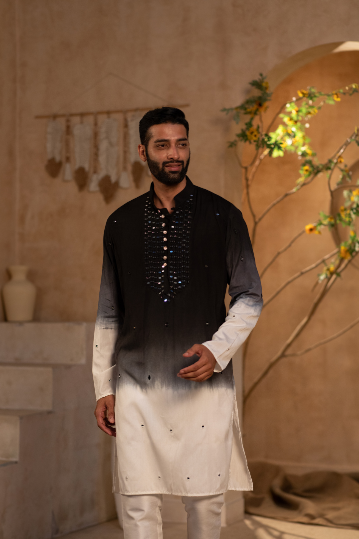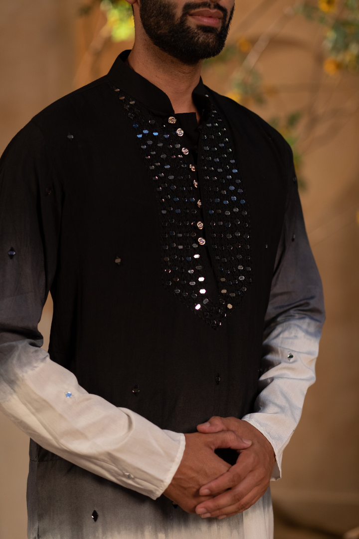A luxurious kurta featuring mirror work on silvery black pure silk. The design creates a mesmerizing play of light.