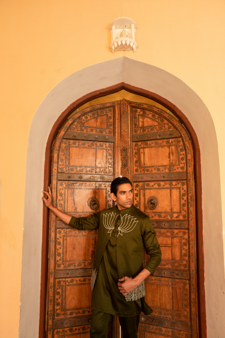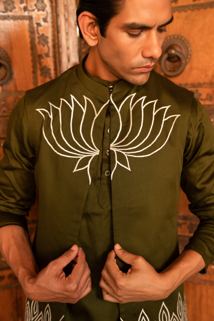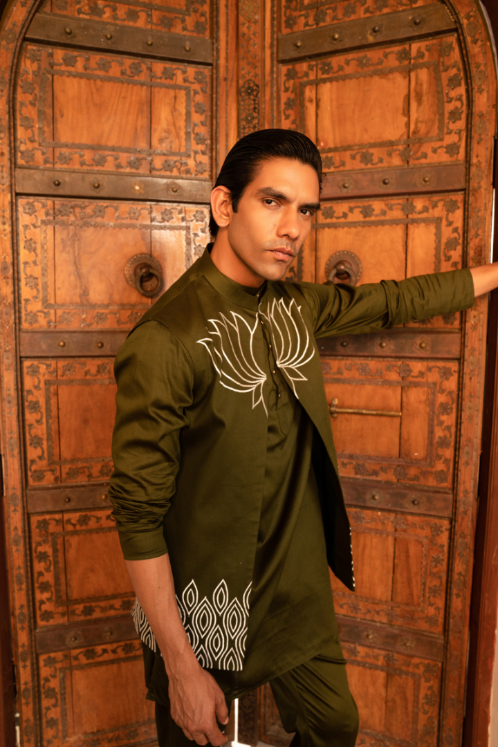 Exude understated elegance with this dark olive green indowestern outfit. The deep, earthy tone offers a versatile and sophisticated option for those who appreciate a more subdued yet stylish look.