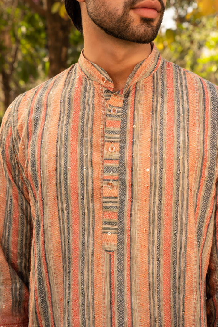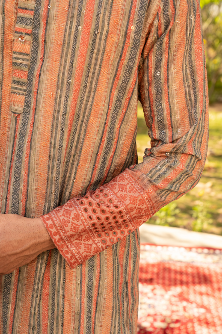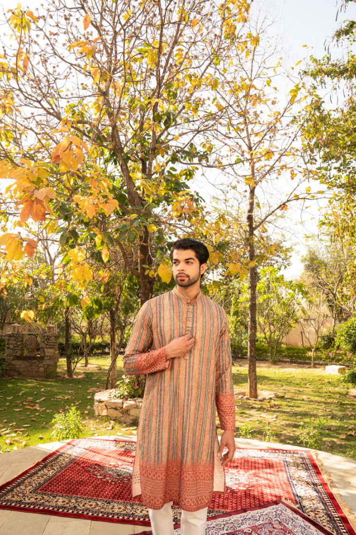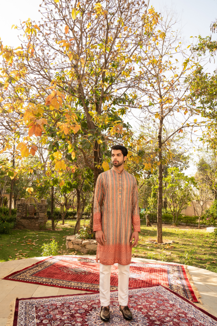 Embrace the warmth of ginger tones with this eye-catching kurta. The color gradient flows from deep, earthy browns to vibrant orange hues, evoking the essence of this aromatic spice.