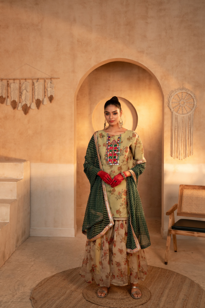 Bloom like a Gul (flower) in this exquisite sharara set by Tammanna. Featuring an organza sharara and top paired with a georgette dupatta, this ensemble offers a perfect blend of textures and elegance.